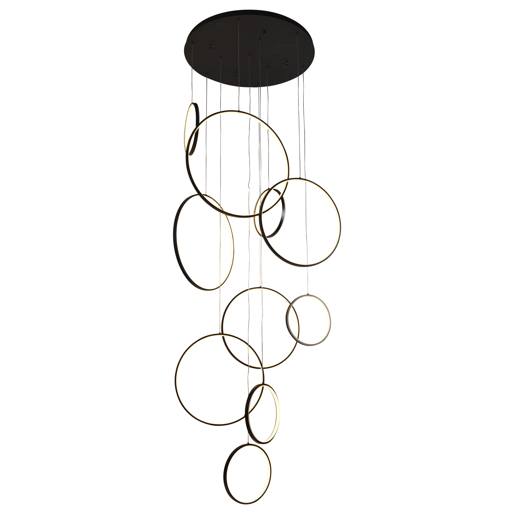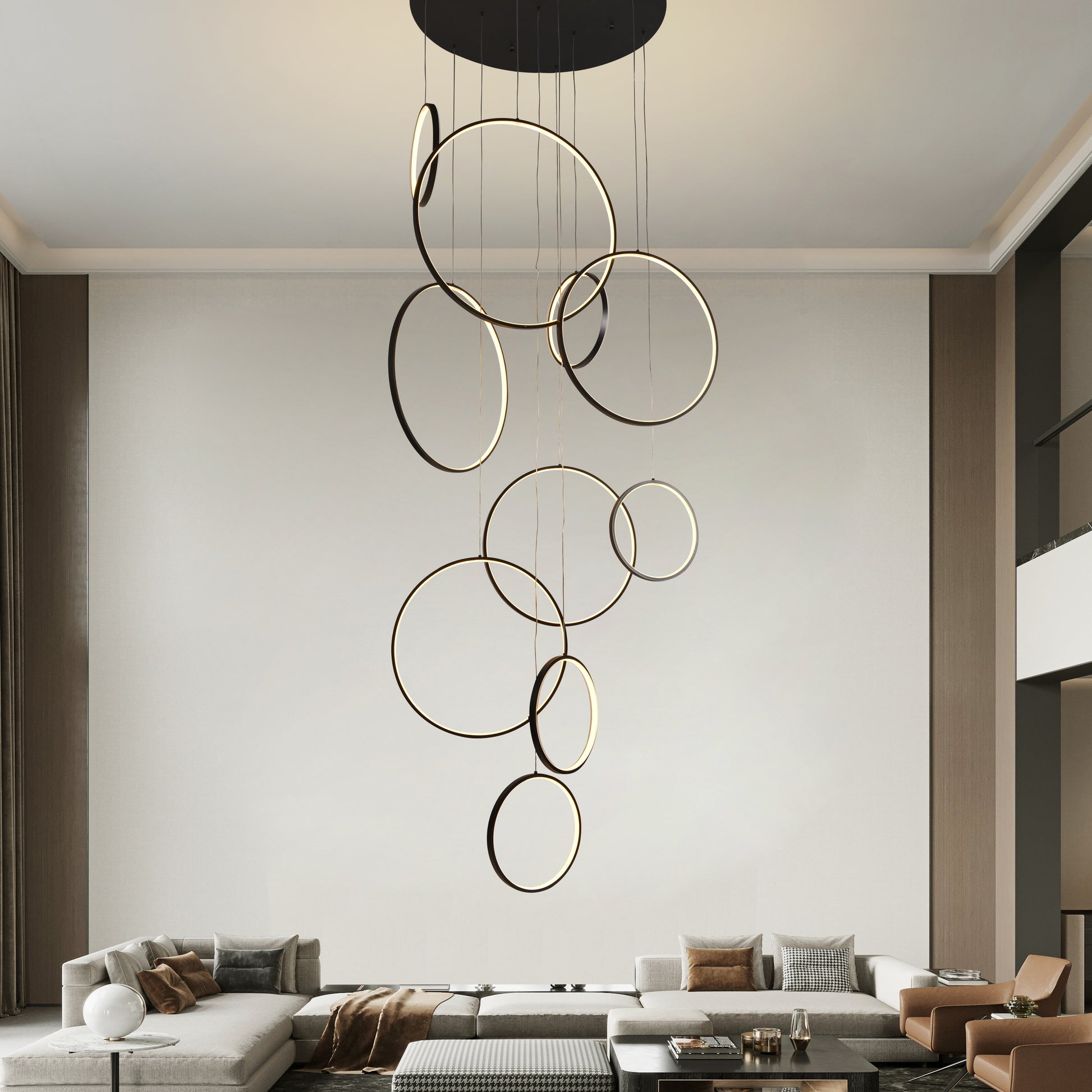Una luminaria majestuosa e imponente, compuesta por 10 aros de diferentes tamaños que descienden en forma de lluvia, perfecta para espacios de gran altura. Su diseño versátil permite ajustar la caída y disposición de los aros para crear múltiples configuraciones y adaptarse a distintos ambientes. La BURJ / 9210 destaca por su refinada estructura y auténtica elegancia, convirtiéndose en una pieza central en cualquier espacio.