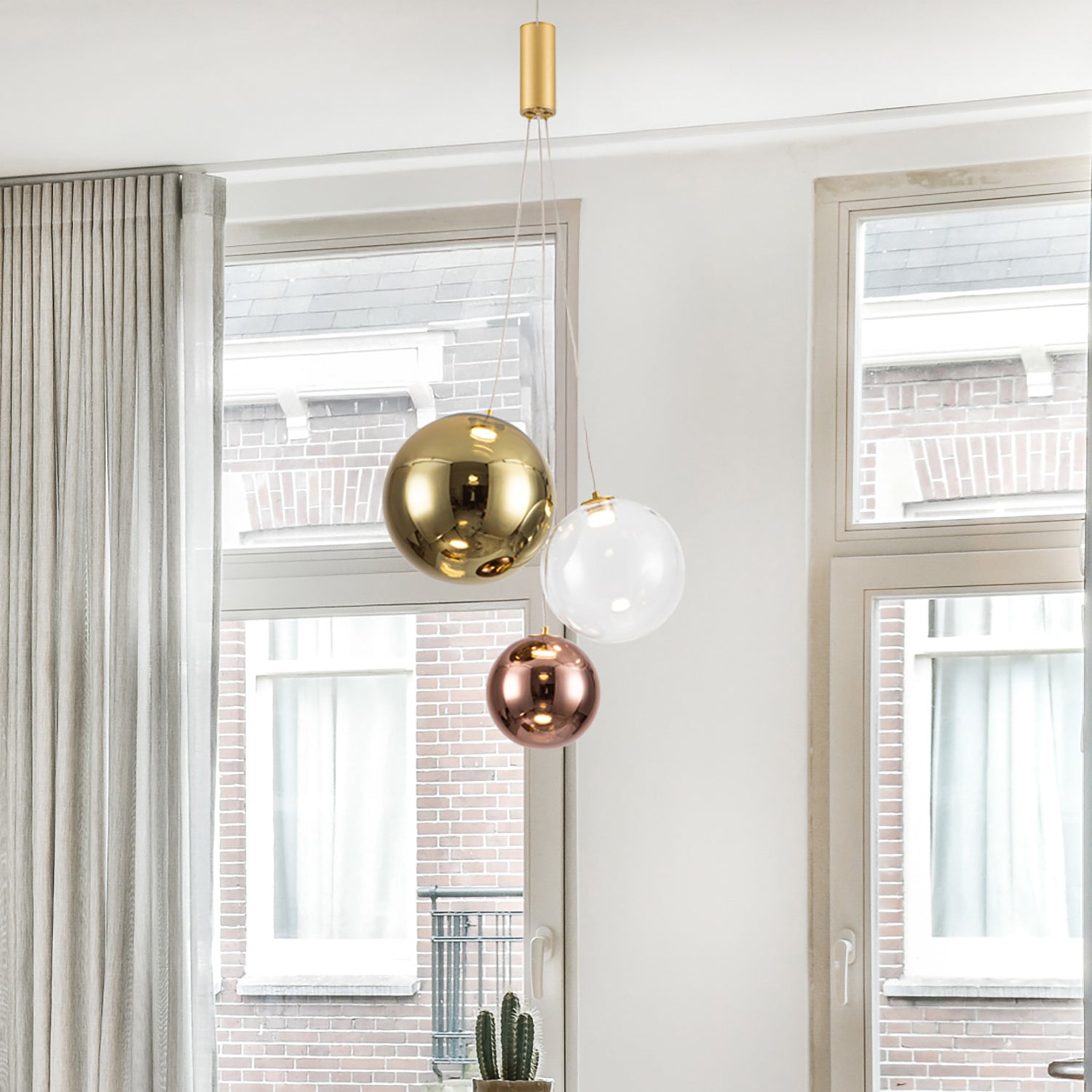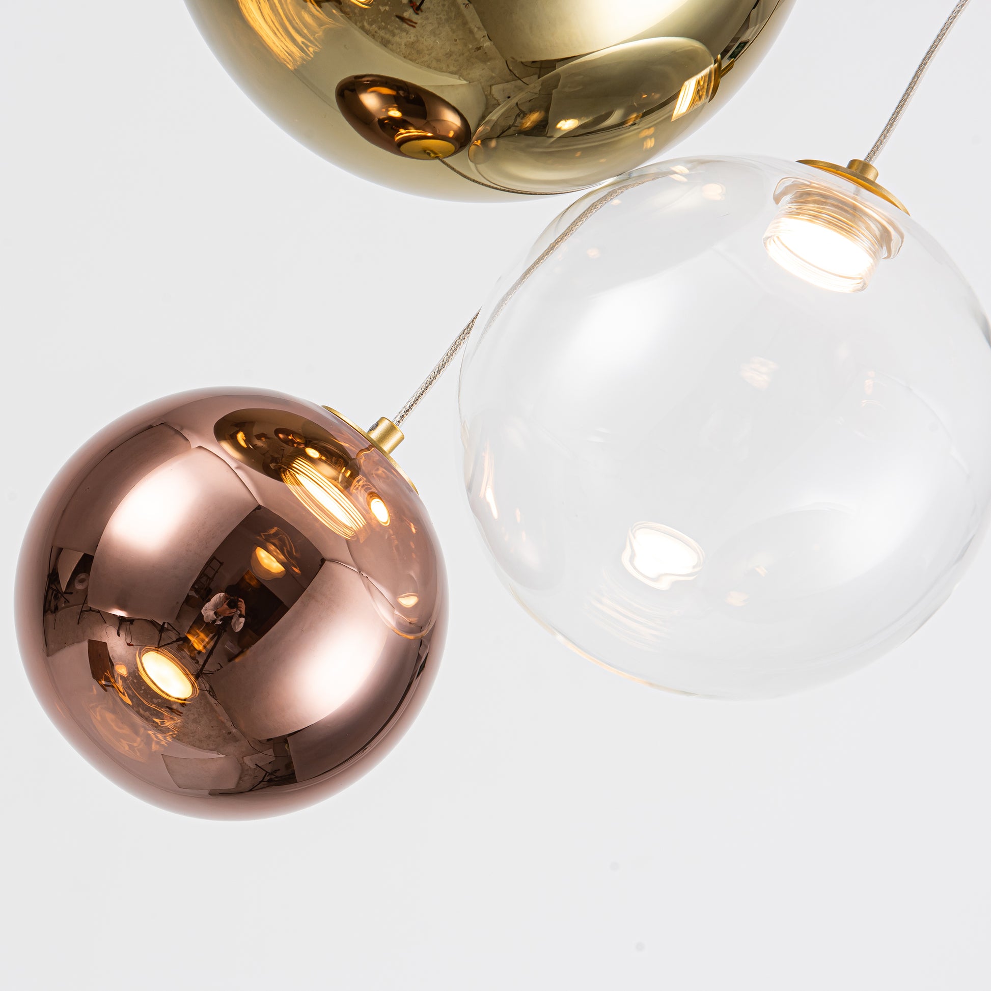 Lámpara colgante moderna con 3 esferas en acabados espejo de oro, transparente y oro rosado. Combina iluminación eficiente con un diseño elegante y sofisticado, ideal para destacar cualquier espacio. Equipada con LED integrado y selector de luz cálida, neutra y blanca, permite adaptar la atmósfera de la habitación según tus preferencias. Inspirada en los astros, ofrece un estilo decorativo único y moderno.