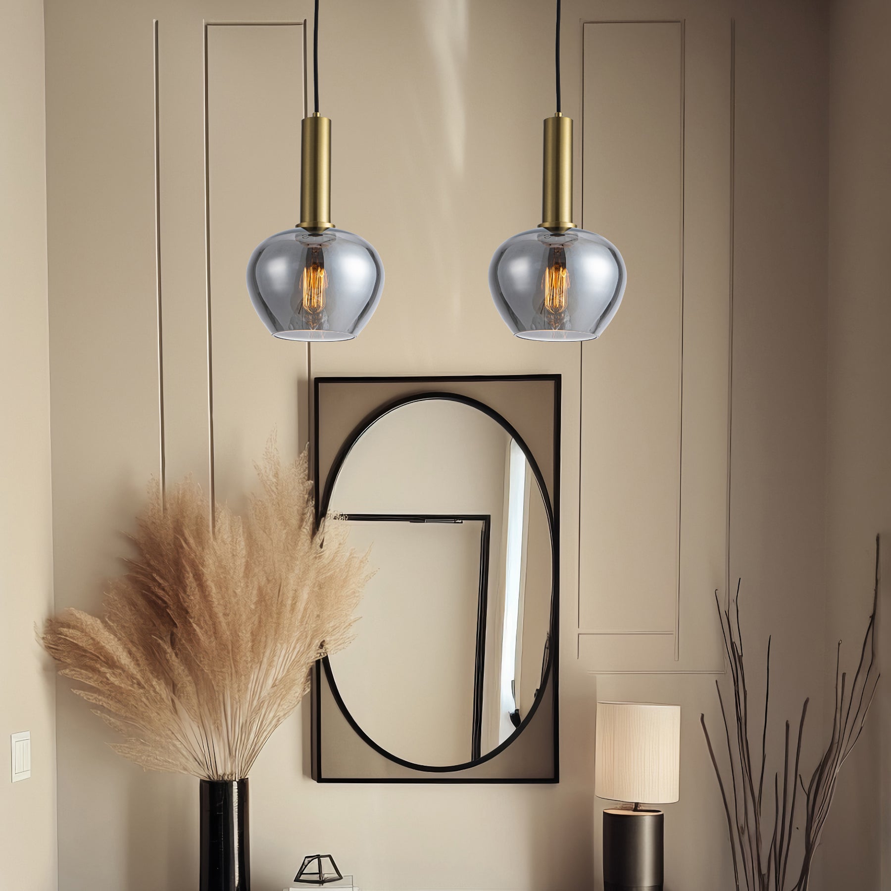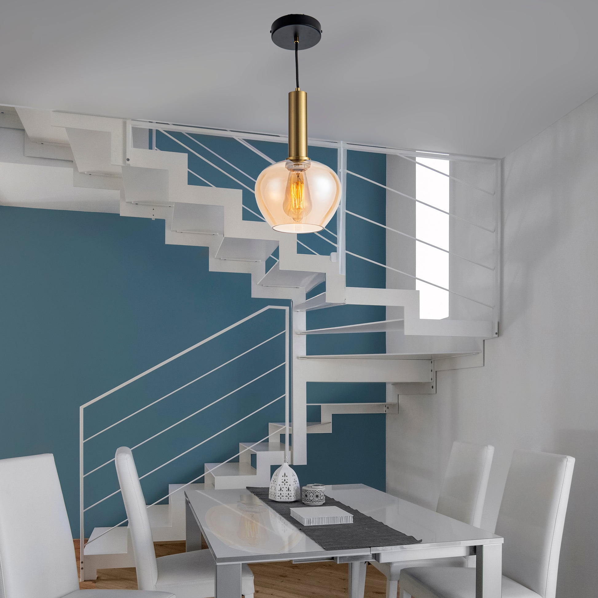 Lámpara colgante moderna que aportará un toque de elegancia y sofisticación a cualquier espacio de tu hogar. Esta impresionante pieza presenta una esfera en acabados ámbar y humo montada en una base cilíndrica en acabado oro, creando un efecto visual deslumbrante. Su diseño está inspirado en los astros celestiales, lo que le otorga un carácter único y llamativo. Fabricada con materiales de primera calidad, garantiza durabilidad y un acabado impecable.