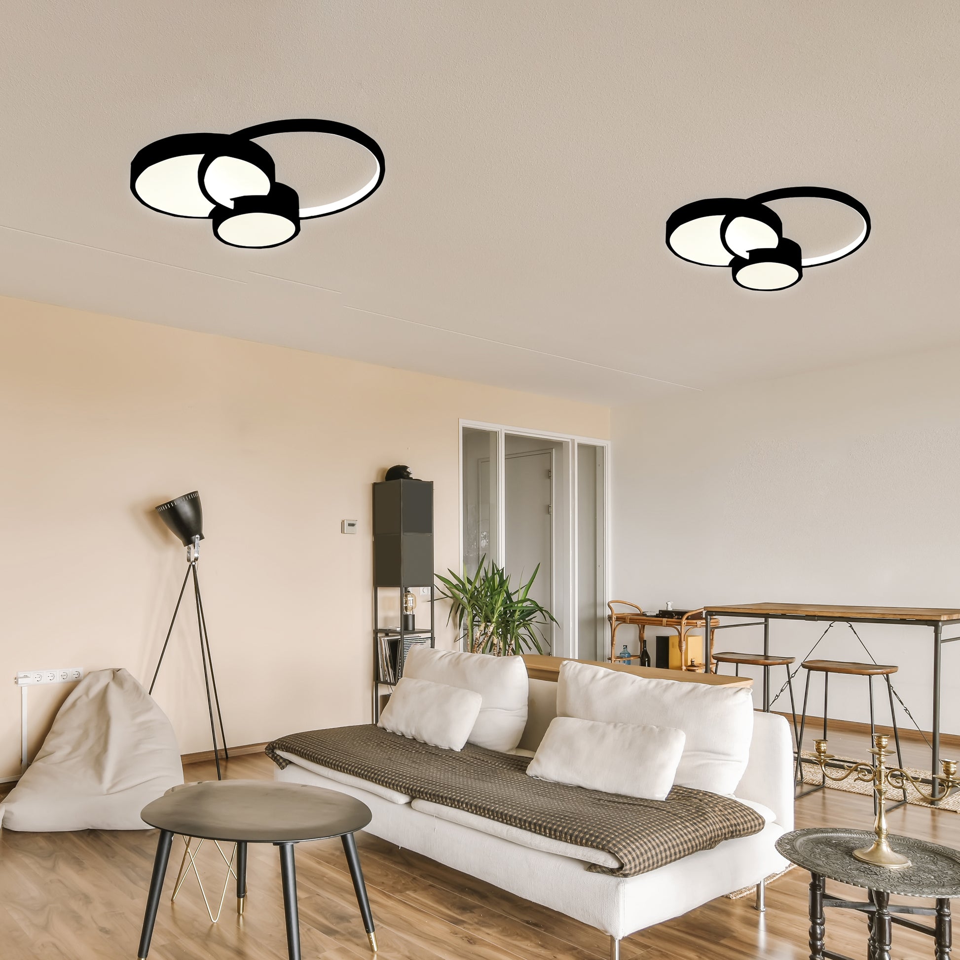 Plafón de techo LED moderno y elegante, ideal para iluminar con estilo cualquier espacio. Compatible con la aplicación Tuya Smart, Alexa y Google Assistant, te permite controlar la iluminación fácilmente desde tu smartphone o por voz. Su diseño en negro mate integra 3 aros con contrastes de luz y perfiles, creando una ilusión inspirada en el crepúsculo lunar. Incluye control remoto y ofrece luz cálida, neutra y blanca, adaptándose a cada ambiente. Una opción sofisticada que combina calidad, tecnología y diseño en un solo producto.
