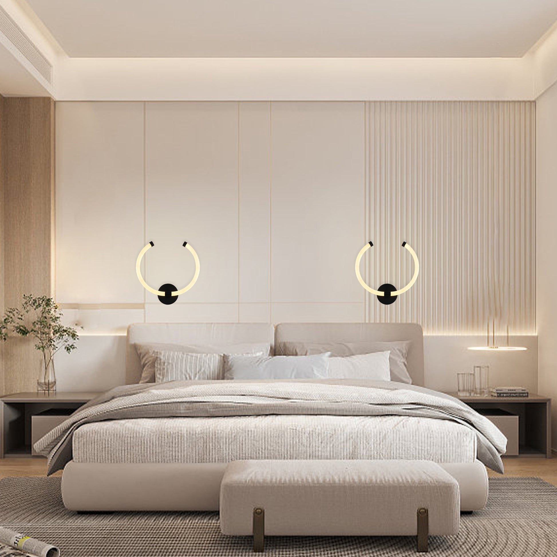 Aplique de pared LED moderno con forma semicircular y acabados elegantes, ideal para cualquier estancia. Ofrece iluminación de 360° mediante tecnología LED, creando una silueta versátil y contemporánea que combina funcionalidad y estilo.