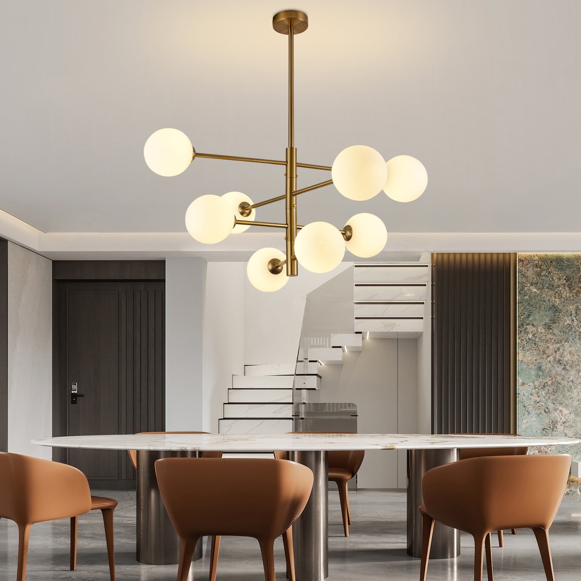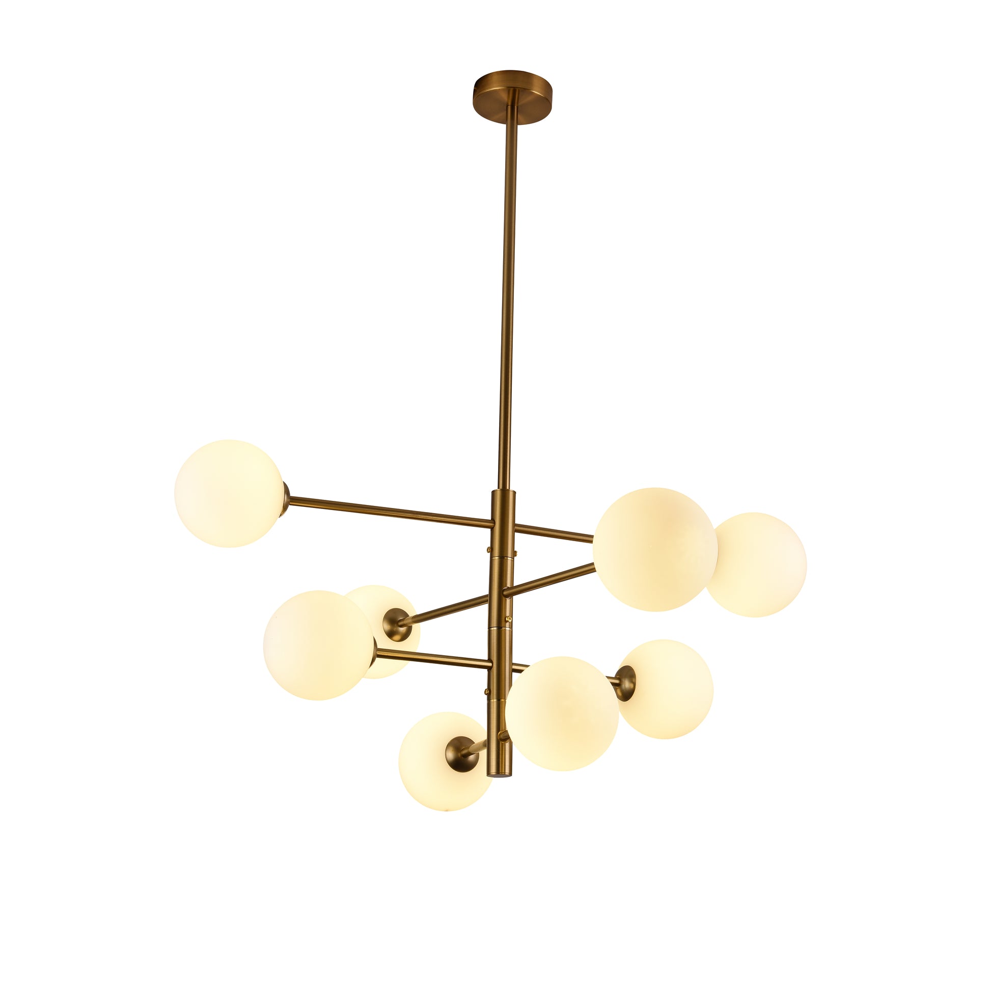 La lámpara colgante AVENILA combina elegancia y dramatismo con sus 8 esferas de cristal blanco opalino, ideales para techos bajos. Sus brazos ajustables lateralmente y el acabado brass aportan un toque de alta gama, integrándose perfectamente en estilos vintage, de mediados de siglo o contemporáneo, creando un efecto sofisticado y moderno en cualquier espacio.