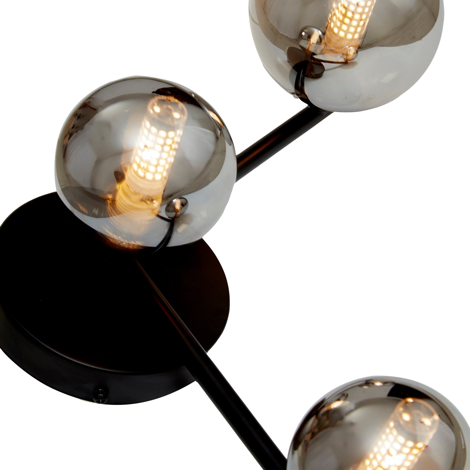 Aplique de pared moderno y minimalista en acabado negro mate, con 4 esferas de vidrio en tono humo cromo degradado de diferentes tamaños. Combina estilo y sofisticación, aportando elegancia y modernidad a cualquier espacio de tu hogar.