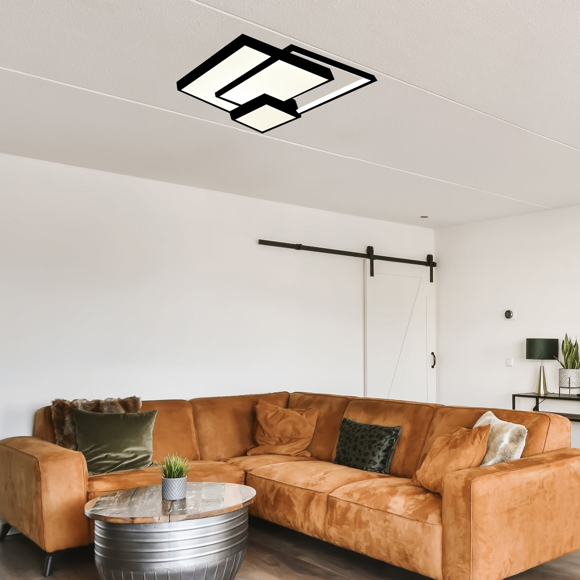 Plafón LED de techo moderno y sofisticado, diseñado para brindar calidad y estilo en cada rincón de tu hogar. Compatible con la aplicación Tuya Smart, Alexa y Google Assistant, ofrece control total desde tu smartphone o por voz. Su diseño en negro mate incorpora 3 figuras cuadradas con difusores lumínicos, creando un efecto visual atractivo y contemporáneo. Incluye control remoto y permite elegir entre luz blanca, cálida o neutra para adaptarse a cualquier ambiente. Una pieza versátil y elegante que transformará tu espacio en un entorno acogedor y moderno.