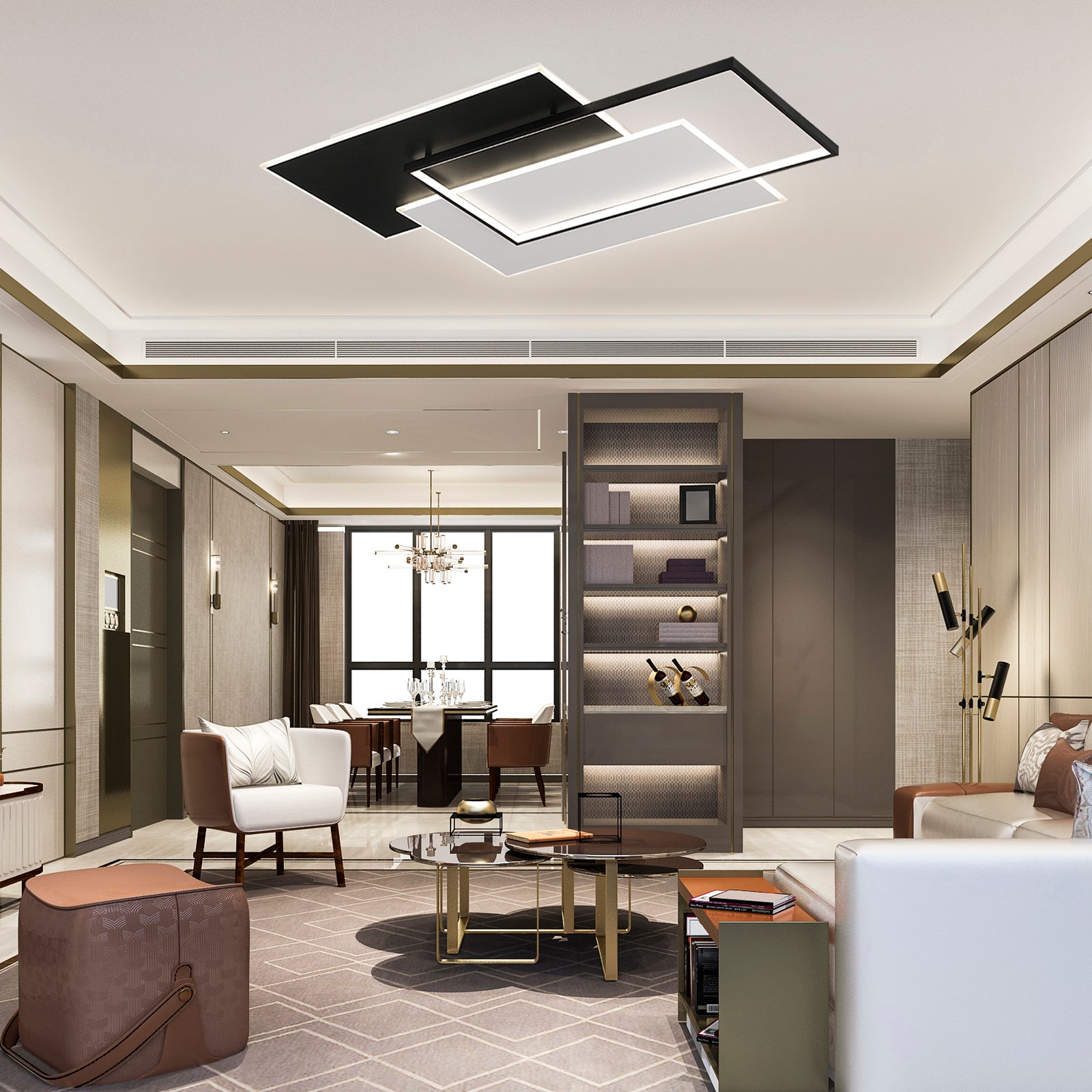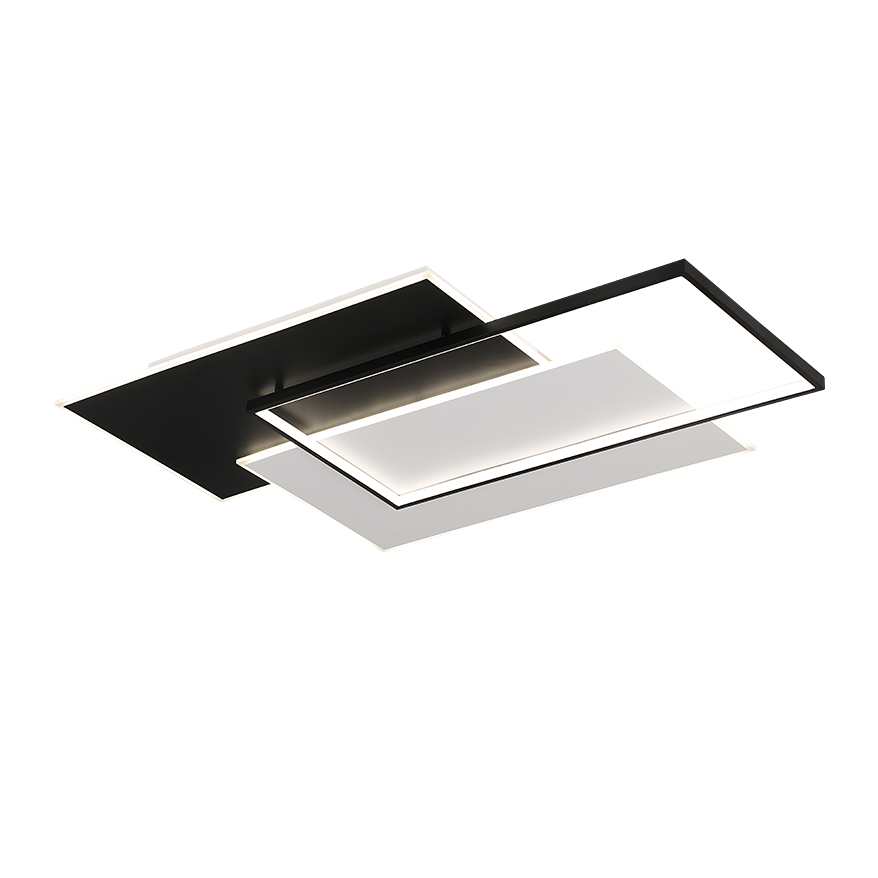 Plafón LED moderno de gran formato con diseño en rectángulos superpuestos en negro y blanco mate. Compatible con app Tuya Smart, Alexa y Google Assistant, y con control remoto incluido. Luz ajustable en blanca, cálida y neutra, ideal para cocinas, encimeras y otros espacios, combinando eficiencia, durabilidad y estilo contemporáneo.