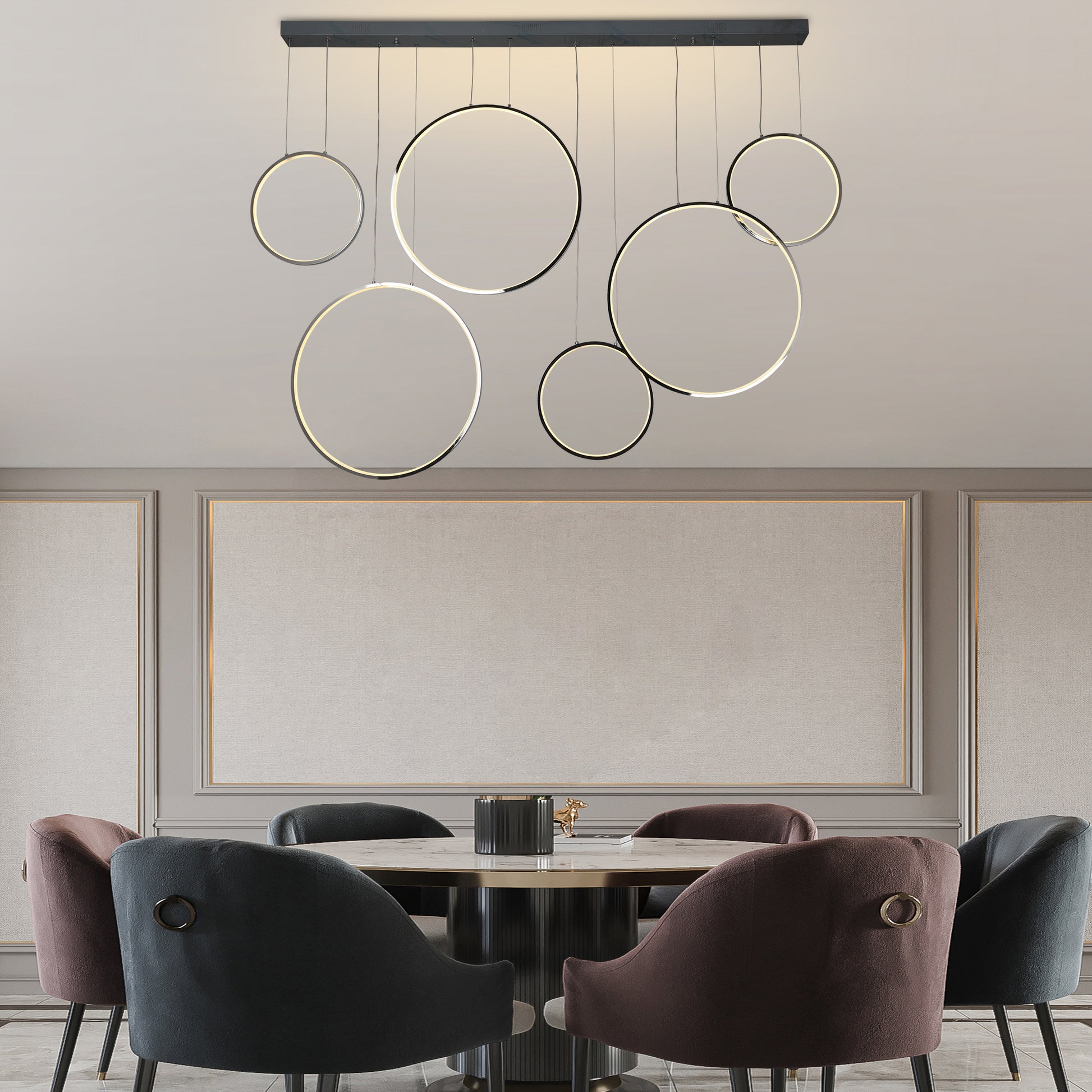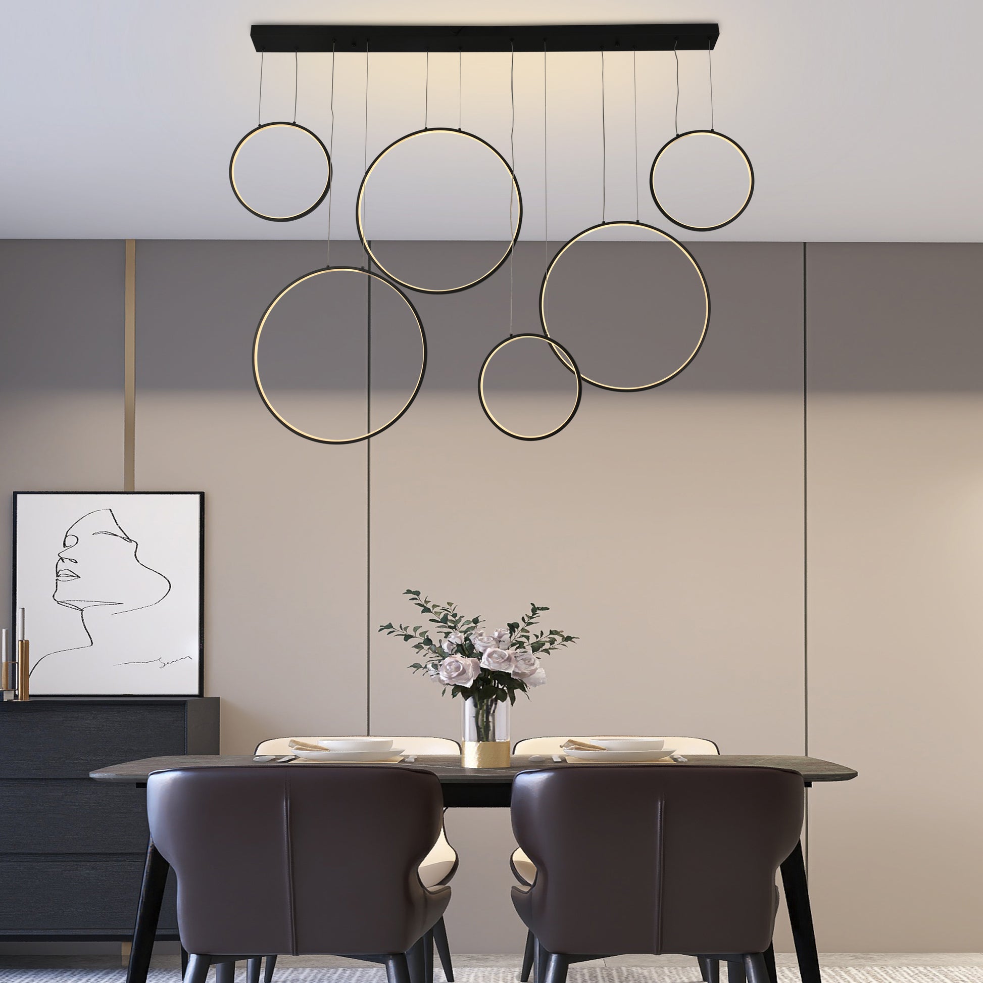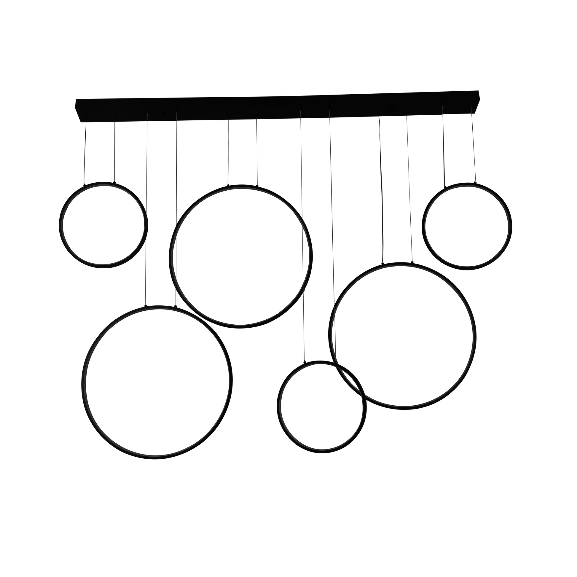 La lámpara colgante BUBBLES destaca por sus 6 anillos LED ajustables, que permiten crear configuraciones equilibradas o diseños escultóricos únicos. Fabricada en aluminio pulido, combina minimalismo y estilo moderno, con control remoto y app para ajustar la luz, temperatura de color y brillo según el ambiente que desees.