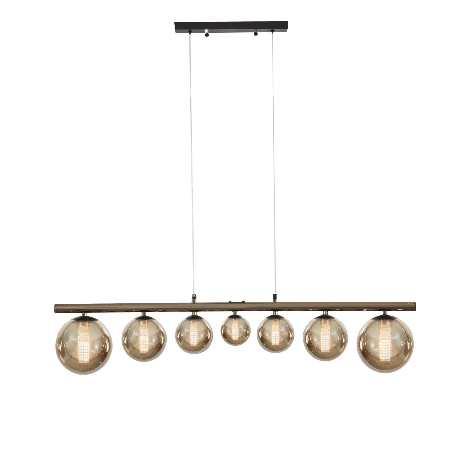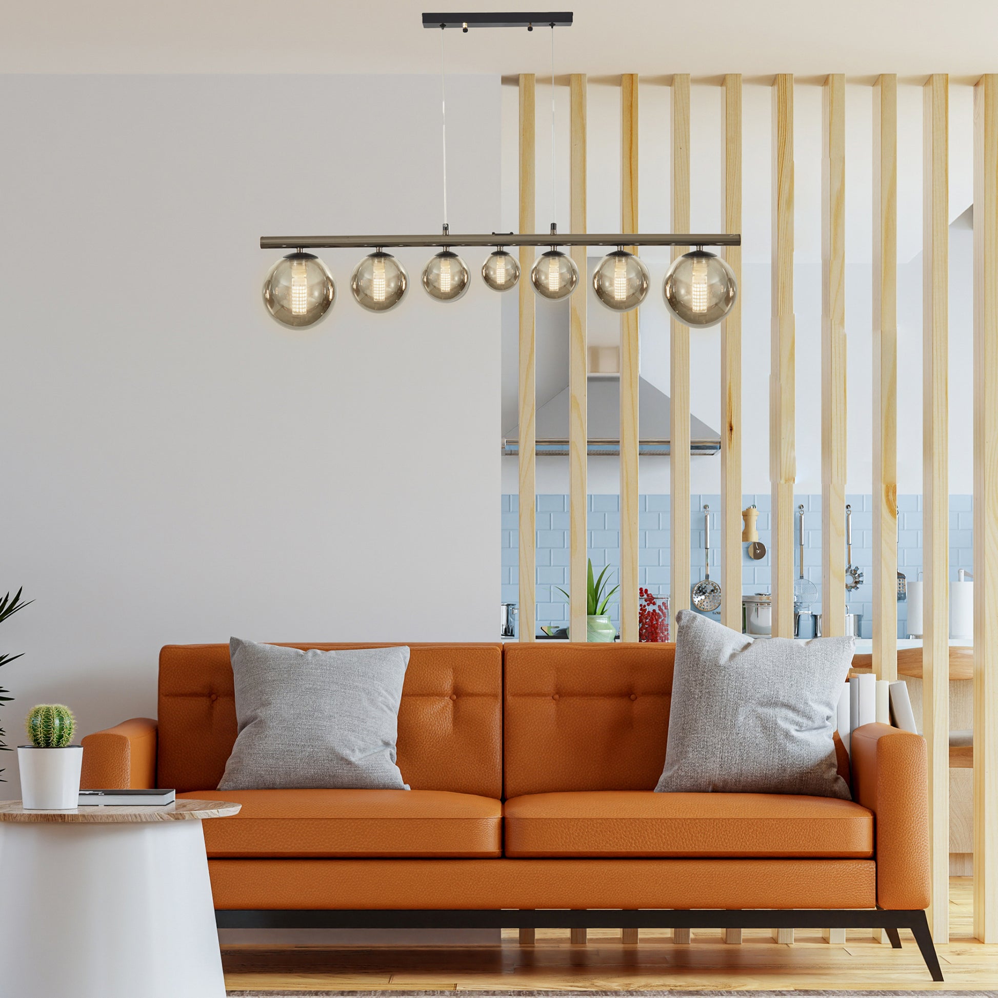 La lámpara colgante BULB / 8318 combina un diseño lineal elegante con acabado cromo negro y 7 esferas de cristal humo degradado. Perfecta para comedores y barras, aporta sofisticación, estilo y un toque moderno a cualquier espacio.