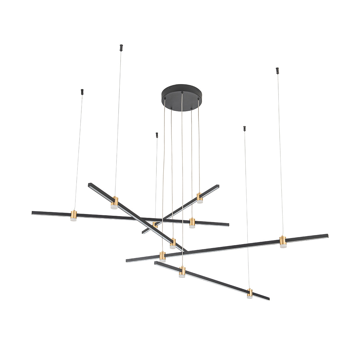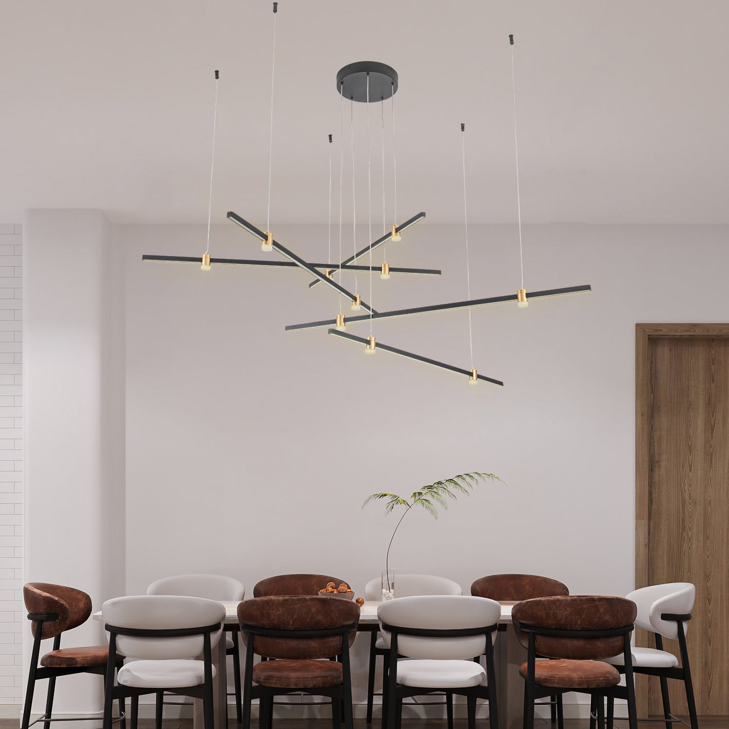 Una luminaria de diseño moderno en negro mate que combina 5 luces lineales y 10 spots en dorado mate para resaltar cualquier espacio. Compatible con la app TUYA Smart y asistentes virtuales como Alexa y Google Assistant, permite un control remoto práctico y versátil. Inspirada en la elegancia natural de los olivos, ofrece luz blanca, cálida y neutra, creando ambientes acogedores y sofisticados. La BULK / 46Q es una pieza única que aporta distinción y personalidad a cualquier decoración.