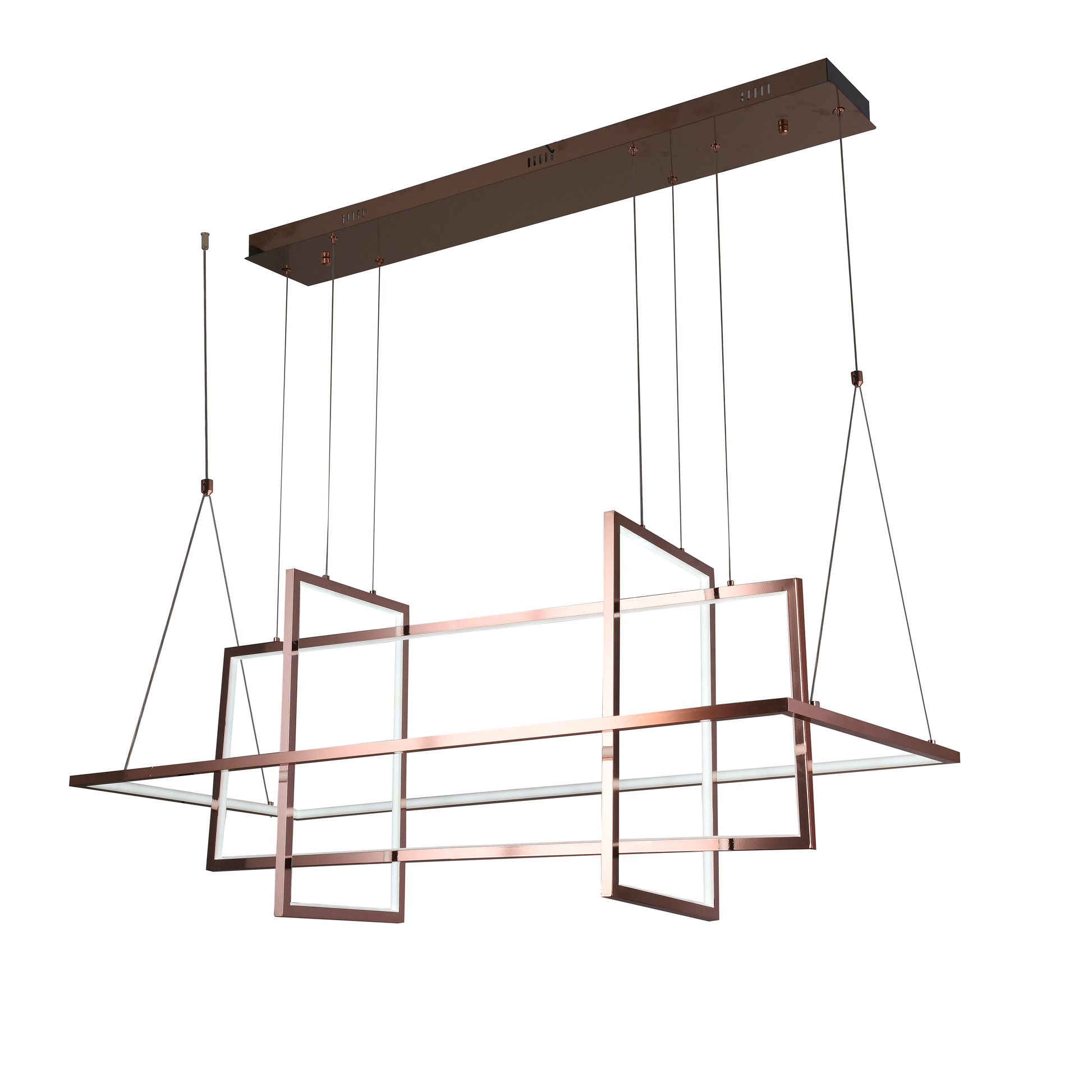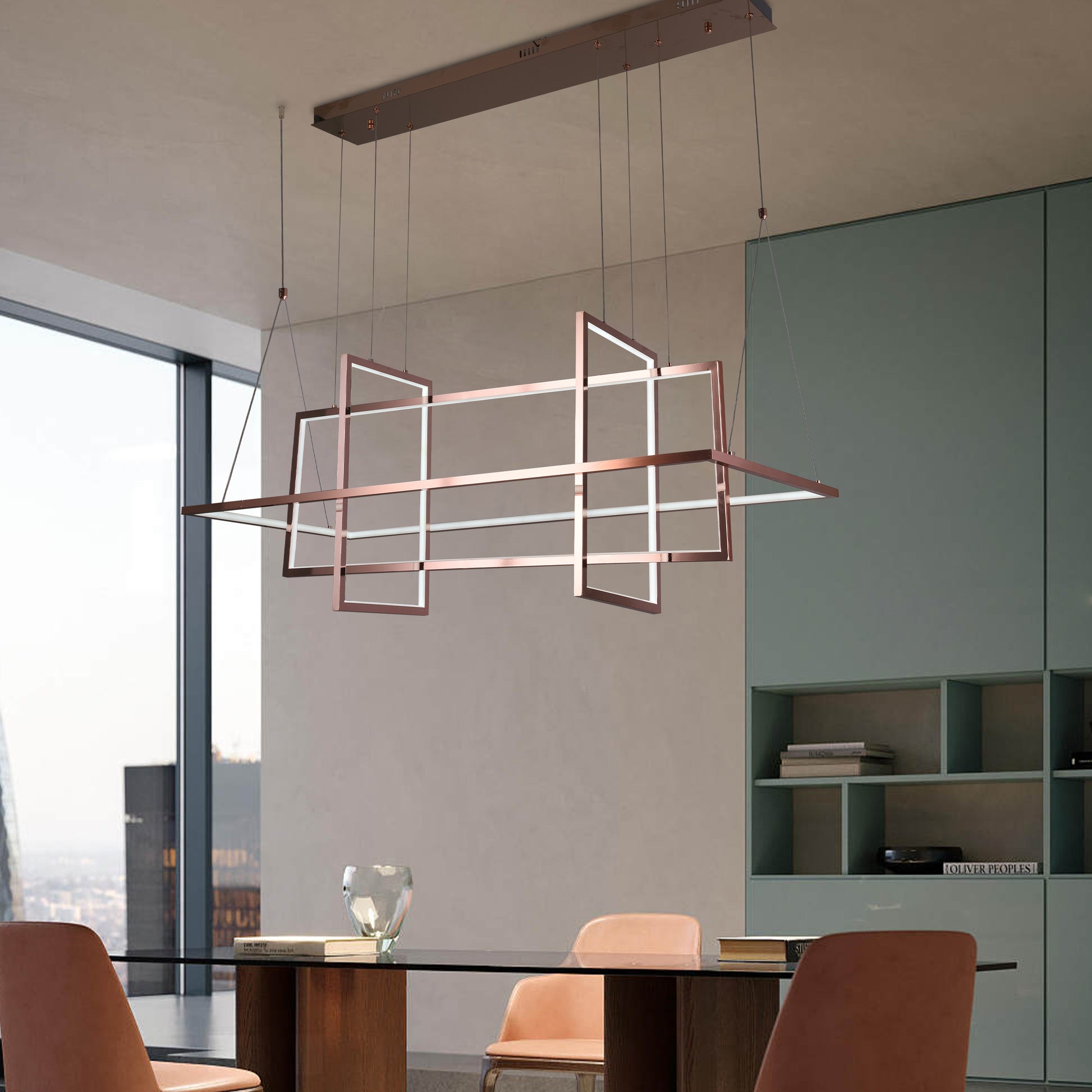 La lámpara CARLO / LCD8013 presenta un diseño moderno en oro rosado con cuatro rectángulos entrelazados que evocan el arte contemporáneo. Ofrece control remoto y compatibilidad con app inteligente para ajustar la intensidad y el tono de luz en blanco, cálido o neutro, logrando ambientes versátiles y sofisticados.