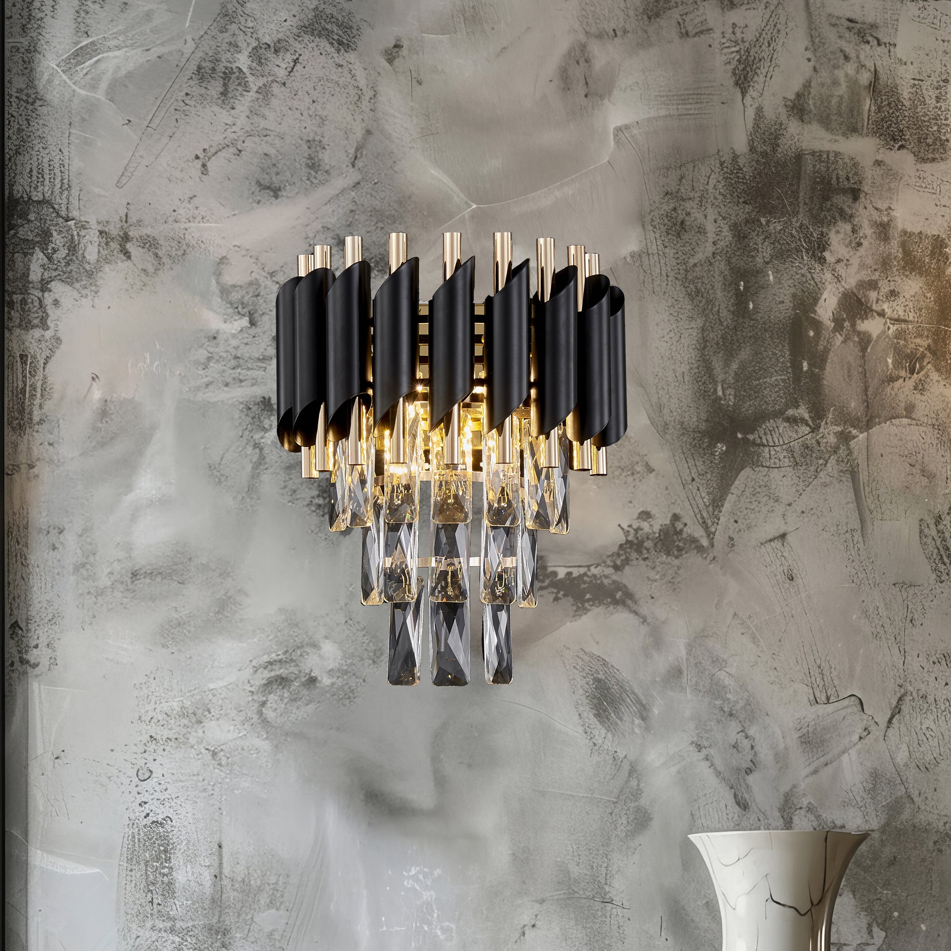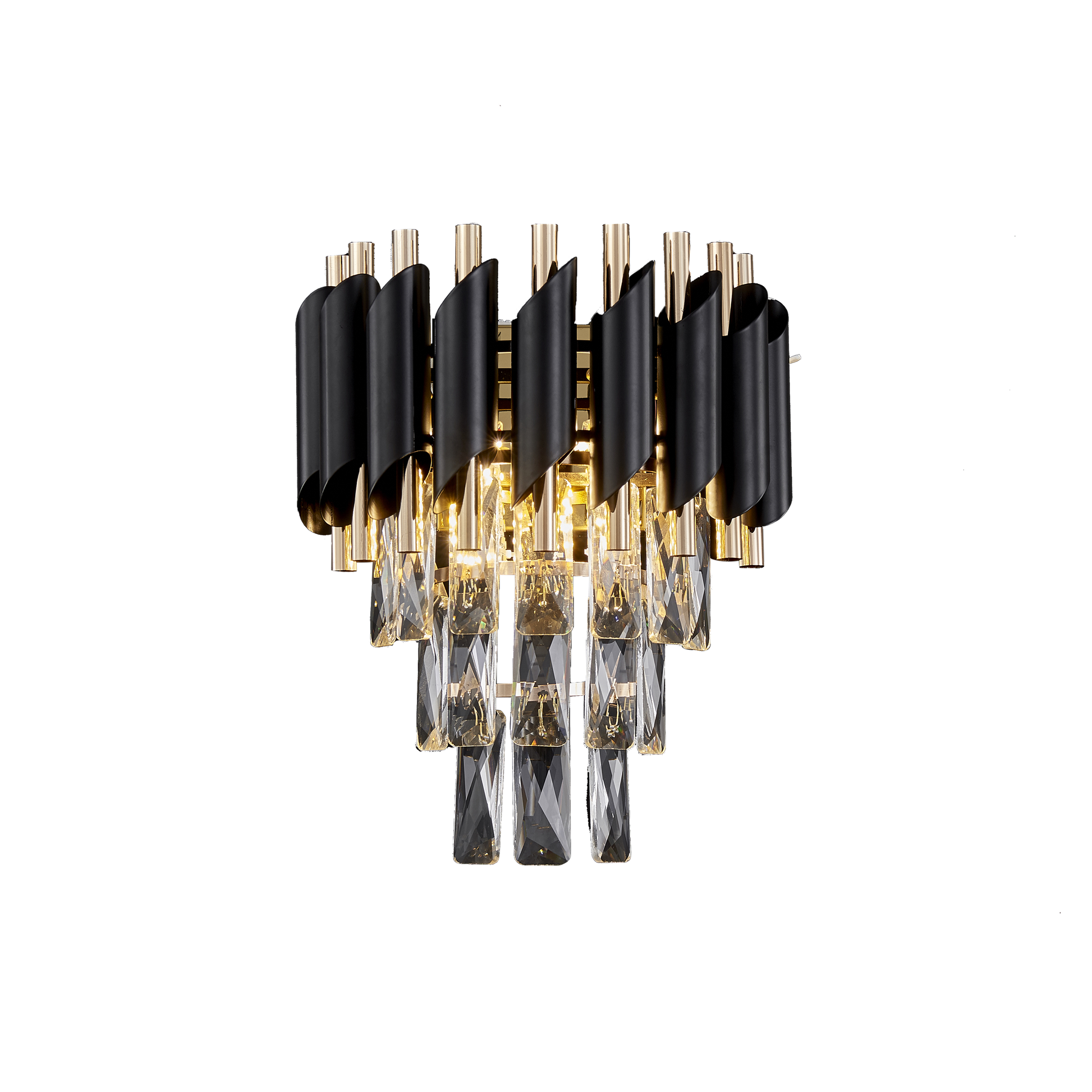 Aplique de pared LED moderno con diseño redondo en vidrio cortado. Combina acabado dorado brillante y negro mate, ofreciendo un toque de lujo y sofisticación. Ideal para crear ambientes elegantes y complementar lámparas colgantes de la misma colección.