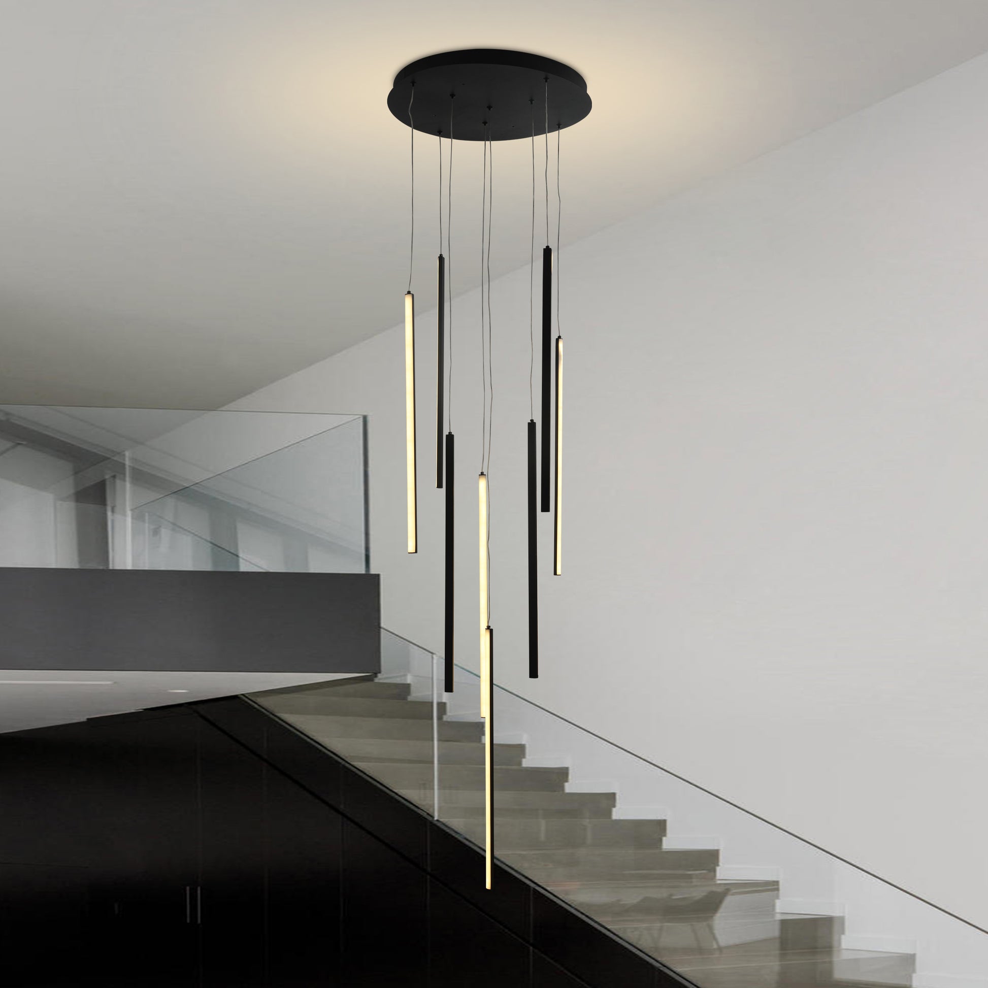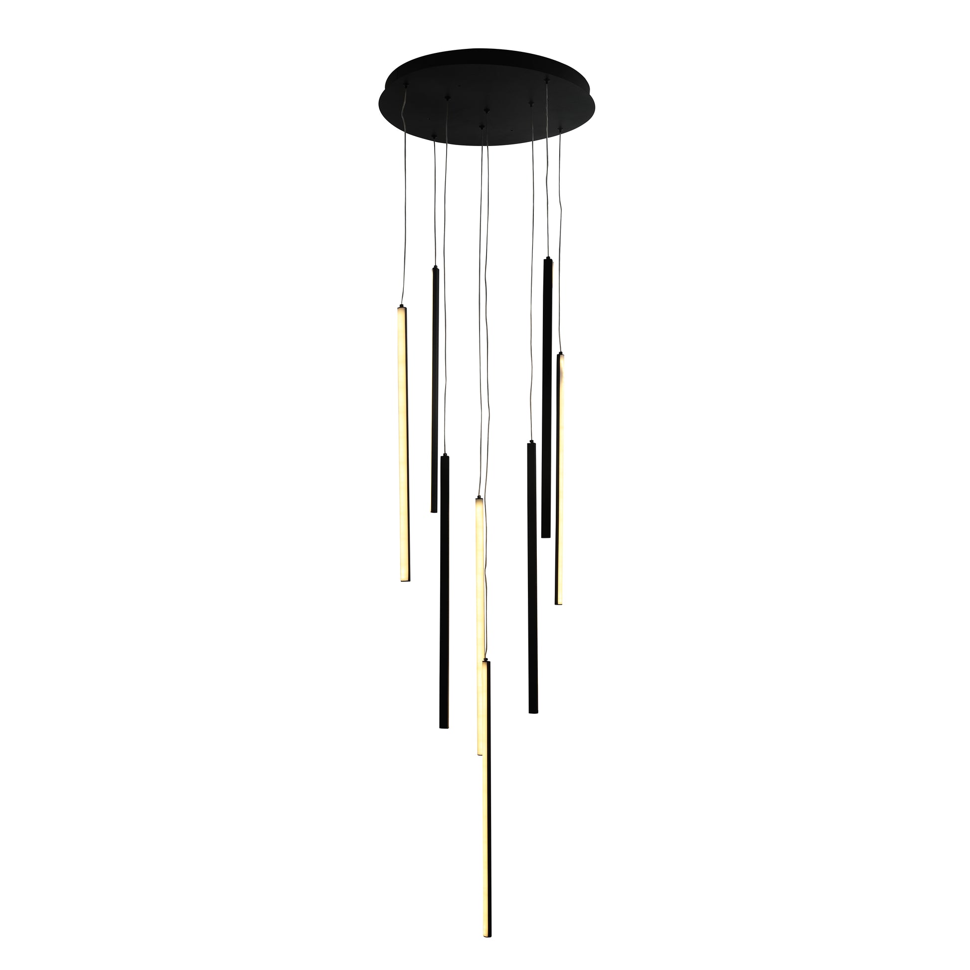 Una luminaria moderna y ajustable que combina estilo y funcionalidad para cualquier hogar. Su tecnología de cambio de color permite modificar fácilmente la temperatura de la luz, mientras que cada cabezal es regulable en altura para dirigir la iluminación según tus necesidades. Con un diseño simple y elegante, la CASCADE / 9289 se adapta a distintos espacios, ofreciendo una iluminación amplia y versátil. Disponible en negro con 8 luces de 55 cm y en cromo negro con 16 luces, creando una apariencia única con sus colgantes.