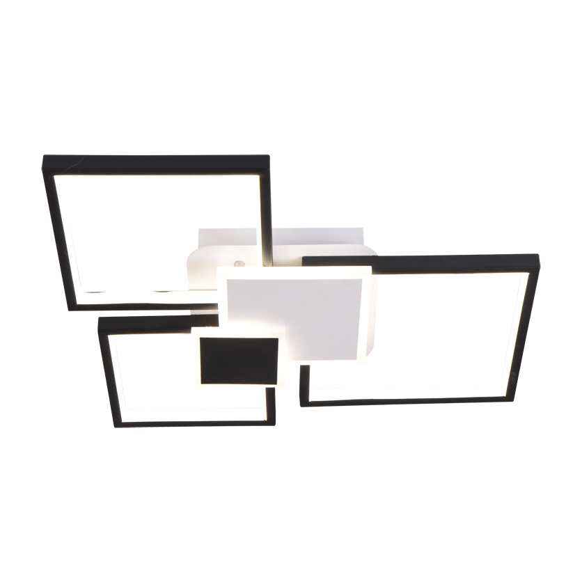 Lámpara de techo LED tipo plafón con diseño contemporáneo en negro y blanco mate. Su estructura combina 5 cuadrados superpuestos con distintos perfiles y difusores que generan una ilusión visual única. Compatible con Tuya Smart App, Alexa y Google Assistant. Incluye control remoto para ajustar intensidad y tonalidad de luz (blanca, cálida y neutra). Una opción moderna, sofisticada y versátil para realzar cualquier espacio.