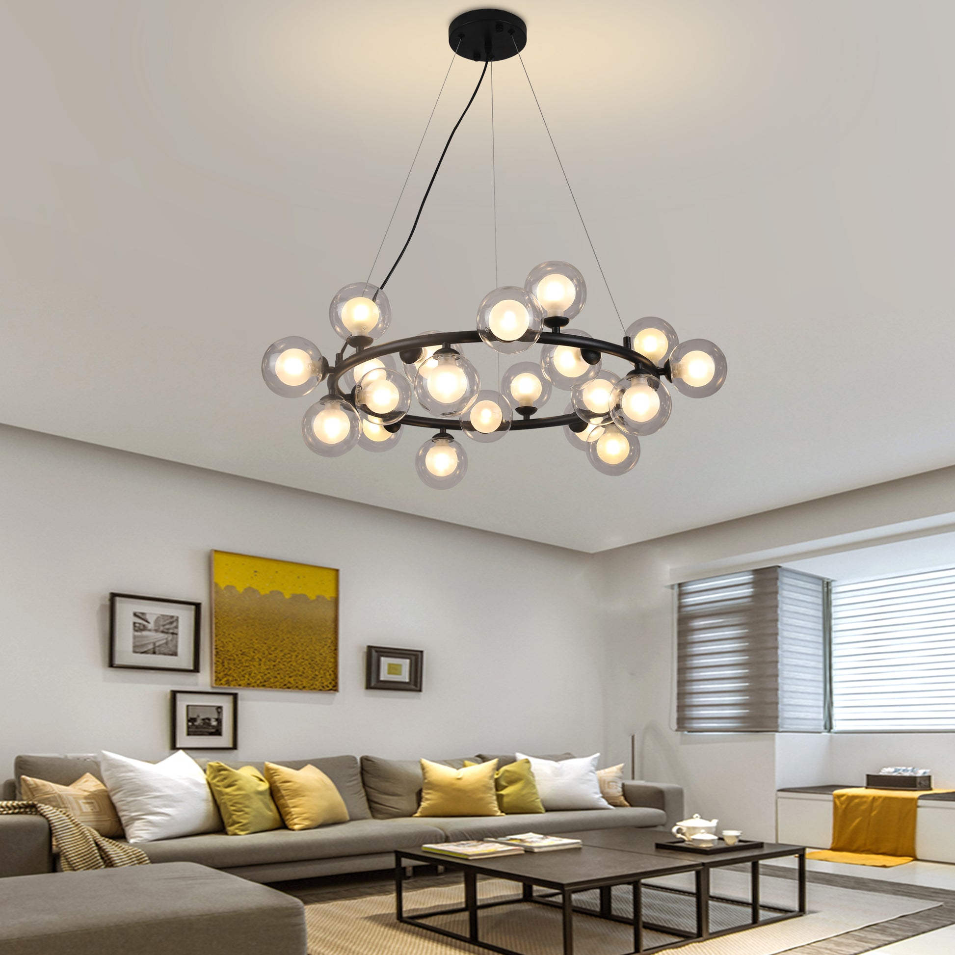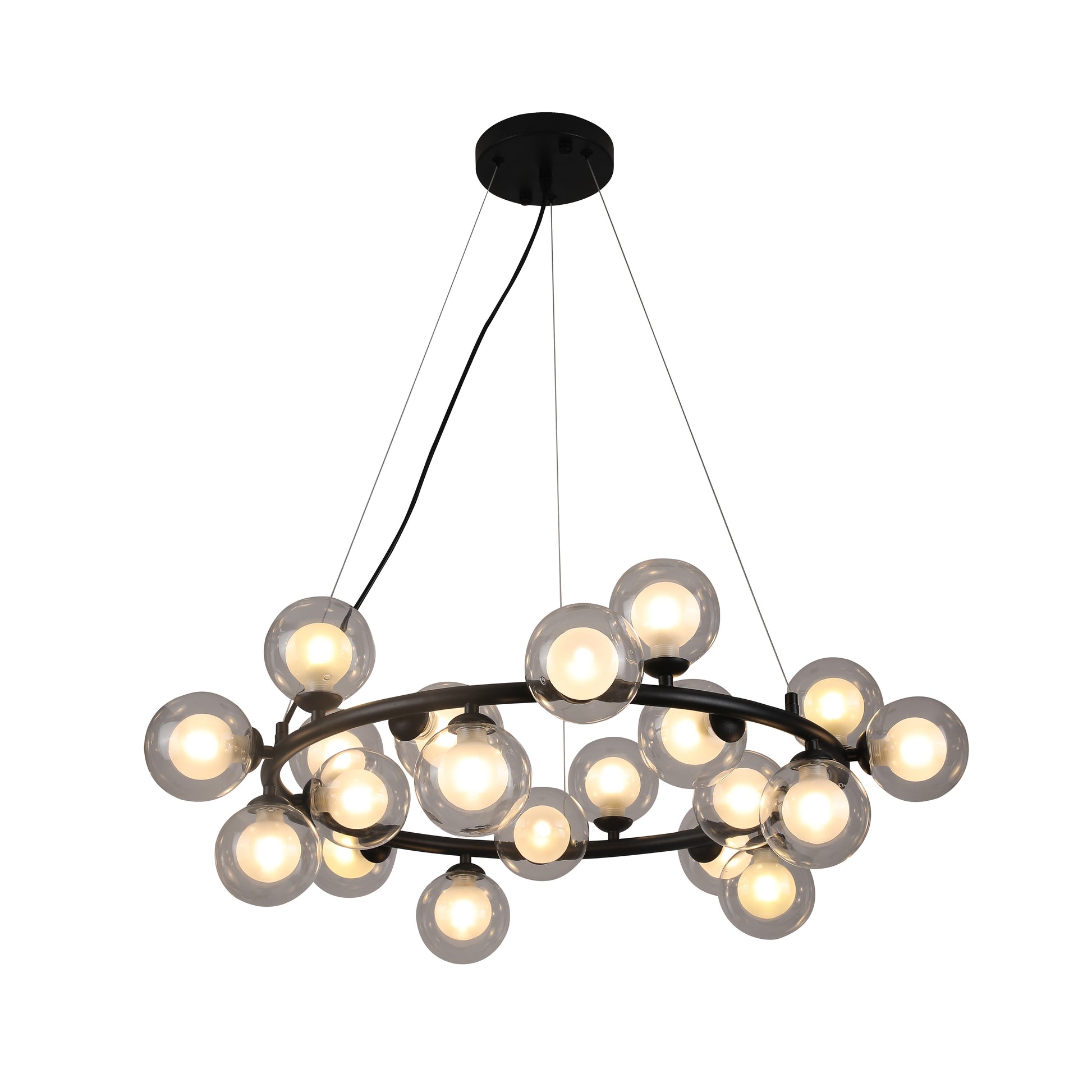 La lámpara colgante DONNA destaca con sus 20 esferas en negro y cristal transparente de doble capa opalino, creando un diseño dinámico y multifacético. Su altura ajustable permite colocarla cerca del techo o como pieza central, convirtiéndose en una fuente de luz funcional y en una obra de arte abstracta que transforma salas de estar, escaleras o entradas con un toque audaz y sofisticado.