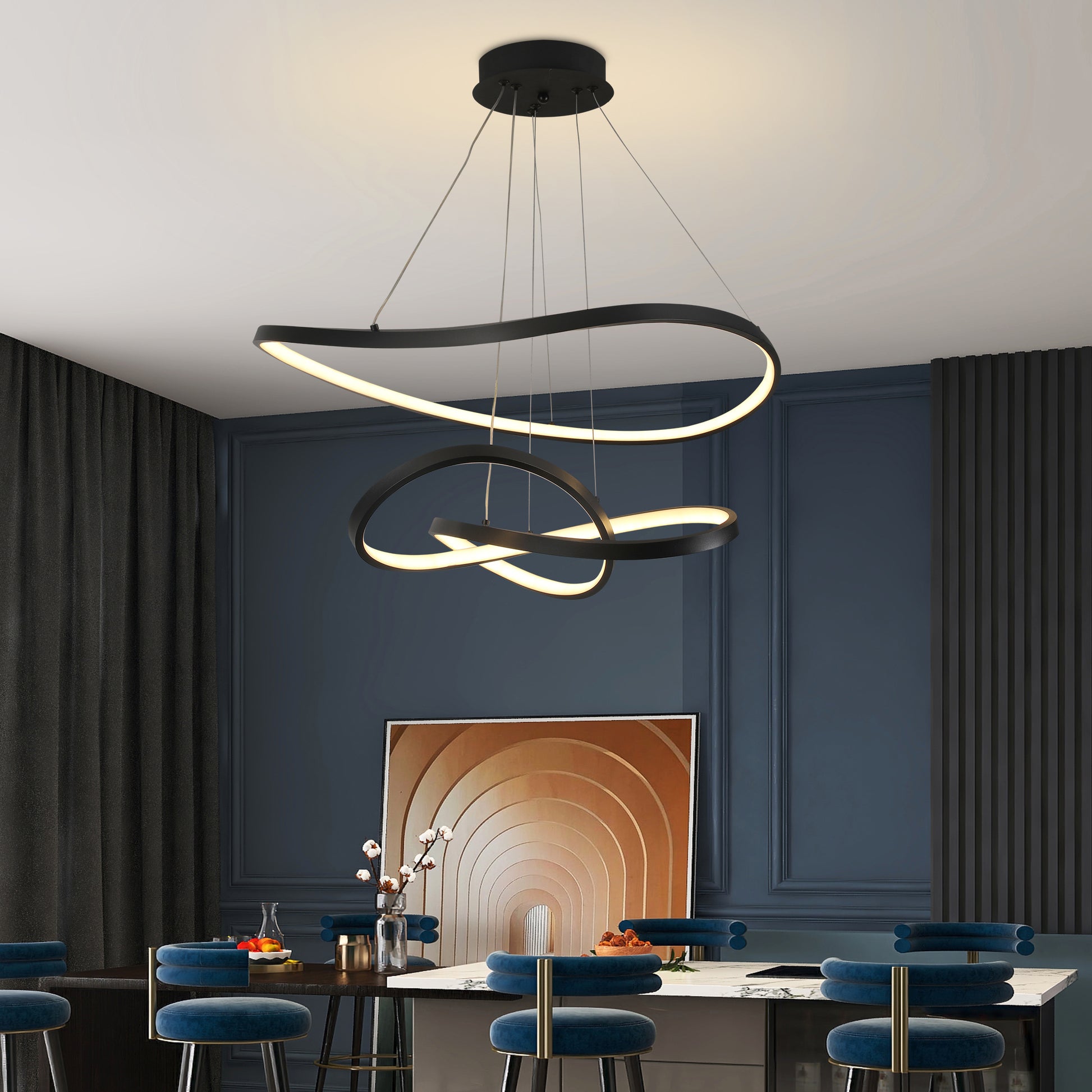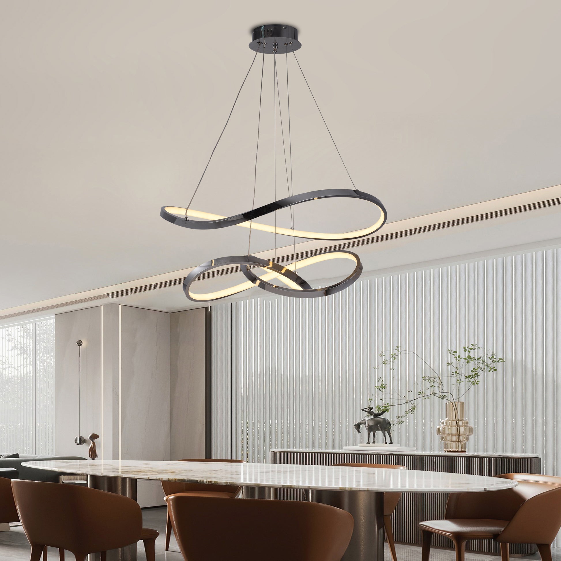 La lámpara colgante DUNE combina estilo y funcionalidad con su diseño de ondas entrelazadas en negro mate y cromo. Con 2 luces LED ajustables, control remoto y app para cambiar la temperatura de color, ofrece una iluminación moderna y versátil para cualquier espacio de tu hogar.