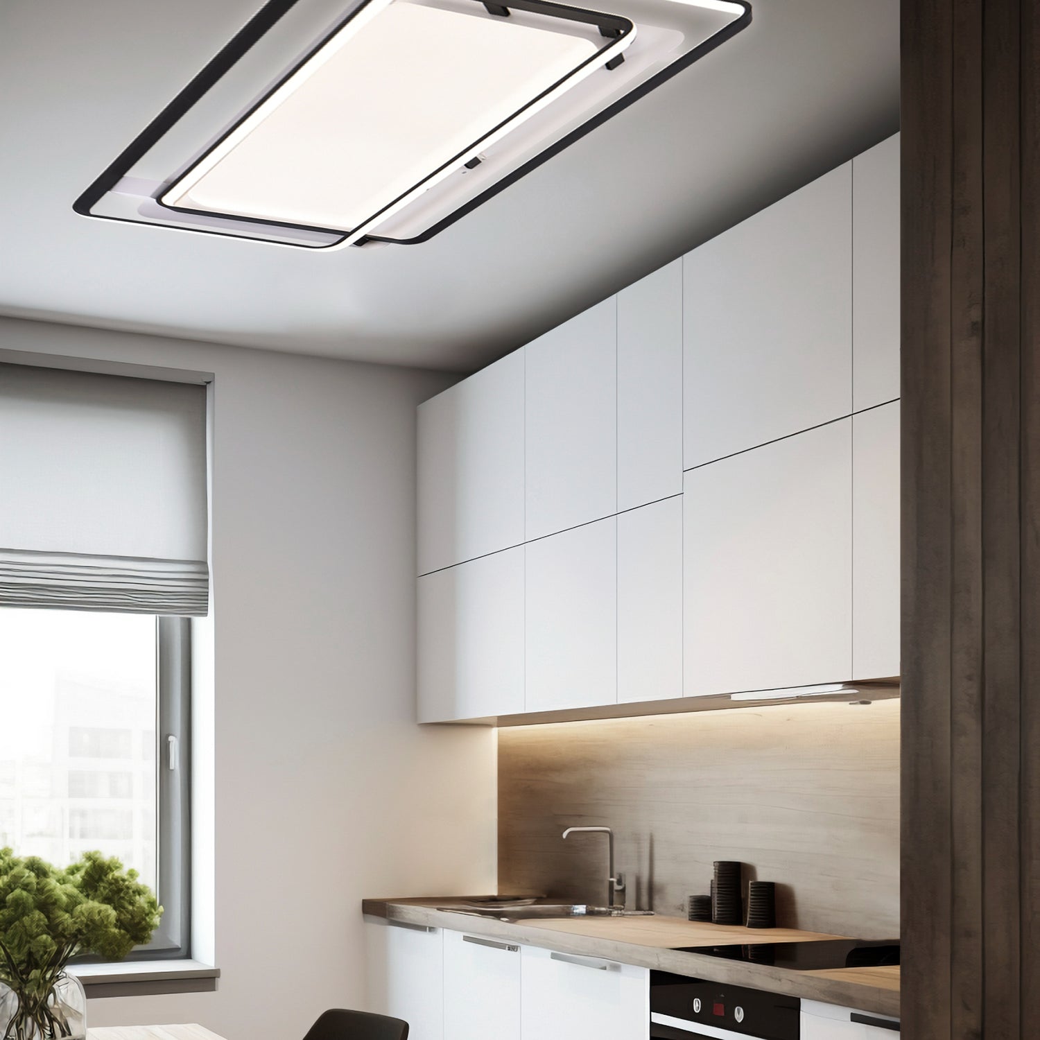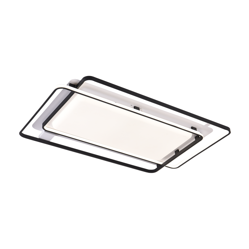 Plafón LED de gran formato con 3 rectángulos en perfiles y difusores distintos, acabado en negro y blanco mate. Compatible con Tuya Smart App, Alexa y Google Assistant, incluye control remoto. Luz ajustable en blanca, cálida y neutra, ideal para cocinas, comedores y encimeras, combinando estilo moderno y sofisticación.
