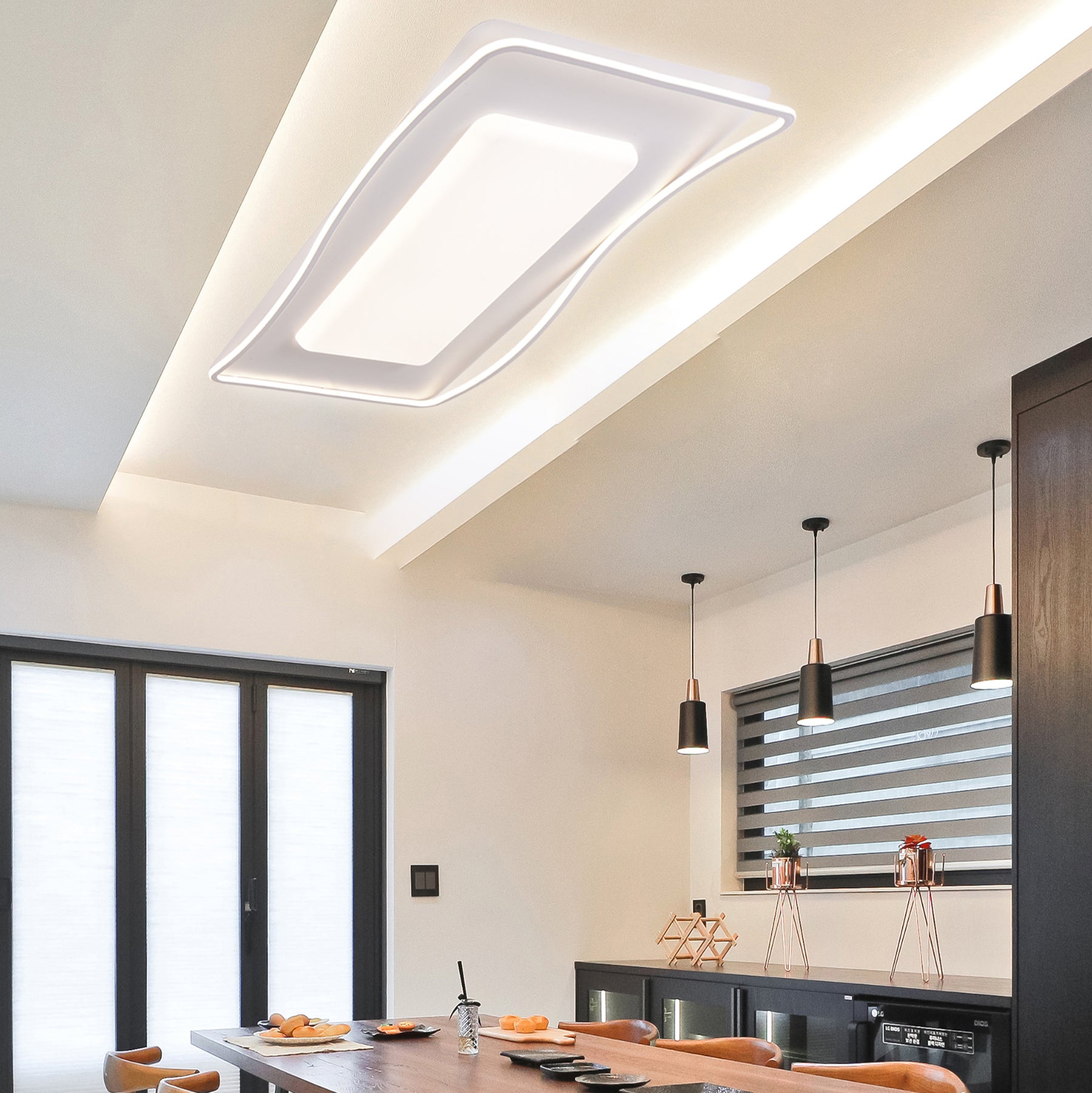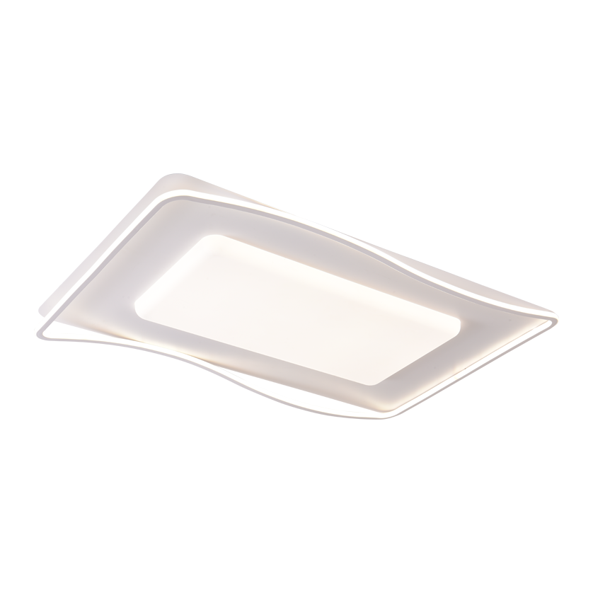 Plafón LED de gran formato con diseño elegante y minimalista en blanco mate. Su difusor en forma de ondas marinas ofrece iluminación suave y uniforme. Compatible con Tuya Smart App, Alexa y Google Assistant, incluye control remoto. Luz ajustable en blanca, cálida y neutra, ideal para ambientes modernos que buscan funcionalidad y estilo.