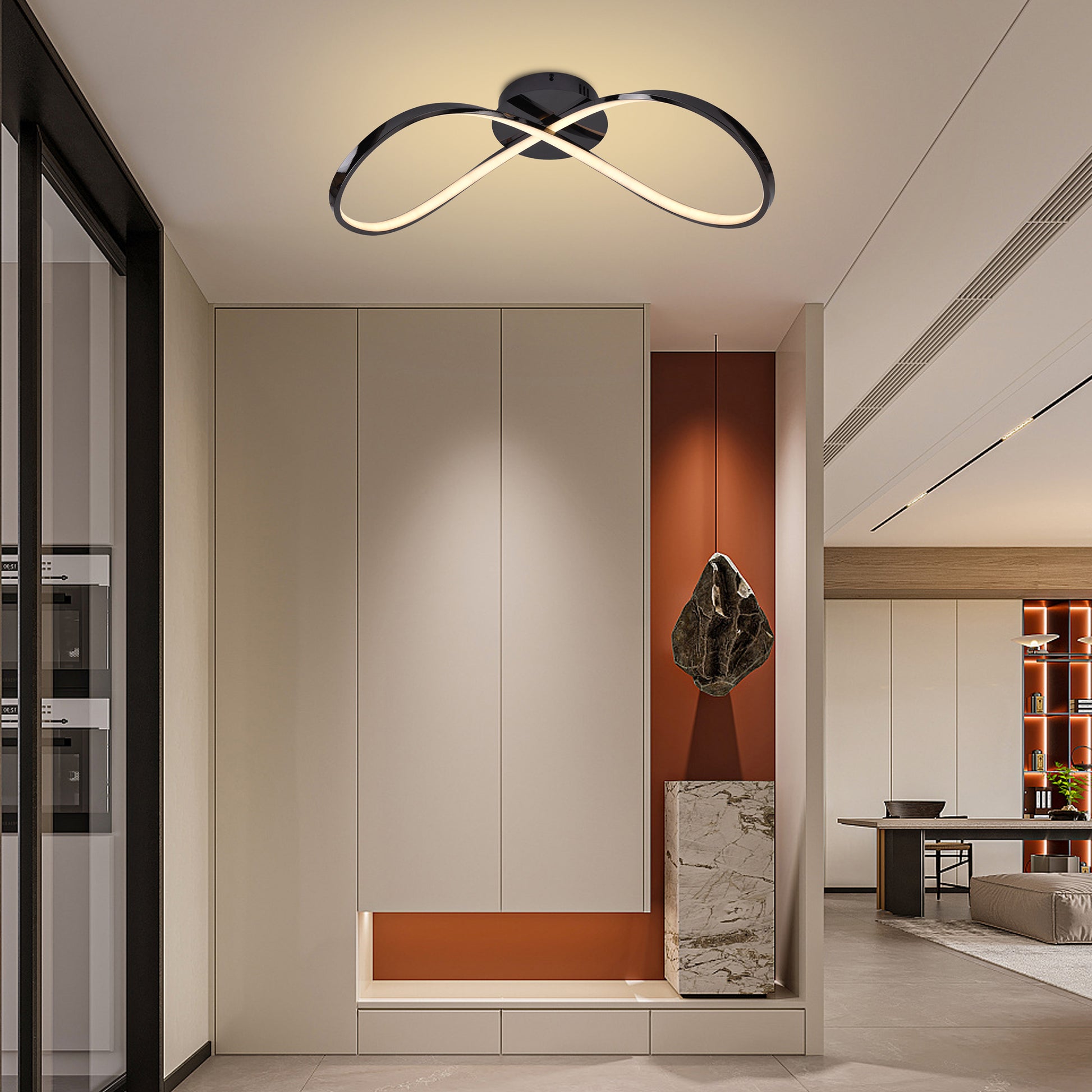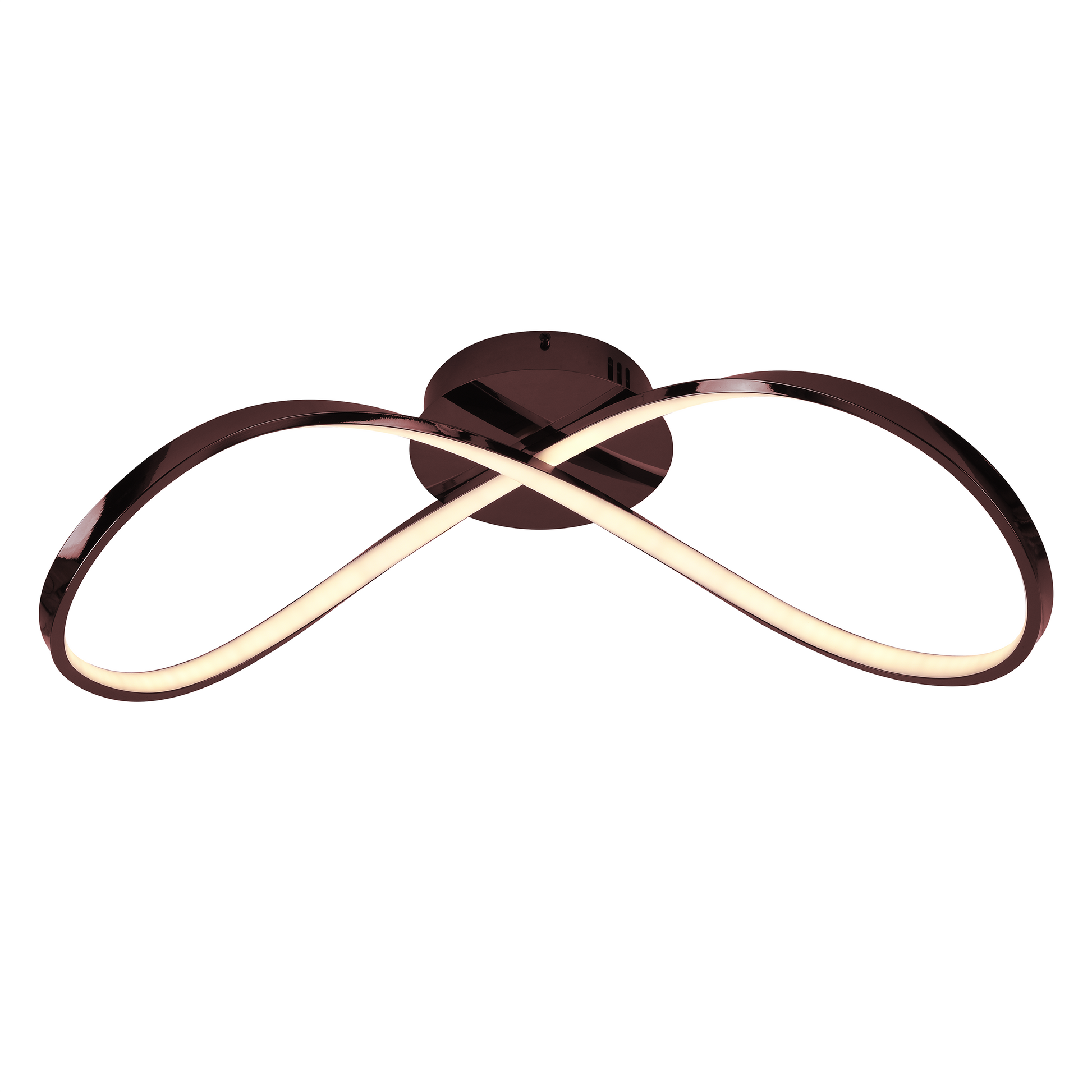 Lámpara de techo minimalista en cromo negro y oro rosado con figura de infinito, ideal para techos bajos. Incluye control remoto y compatibilidad con app para ajustar la intensidad y el color de la luz (blanca, cálida y neutra), creando el ambiente perfecto en cualquier momento.
