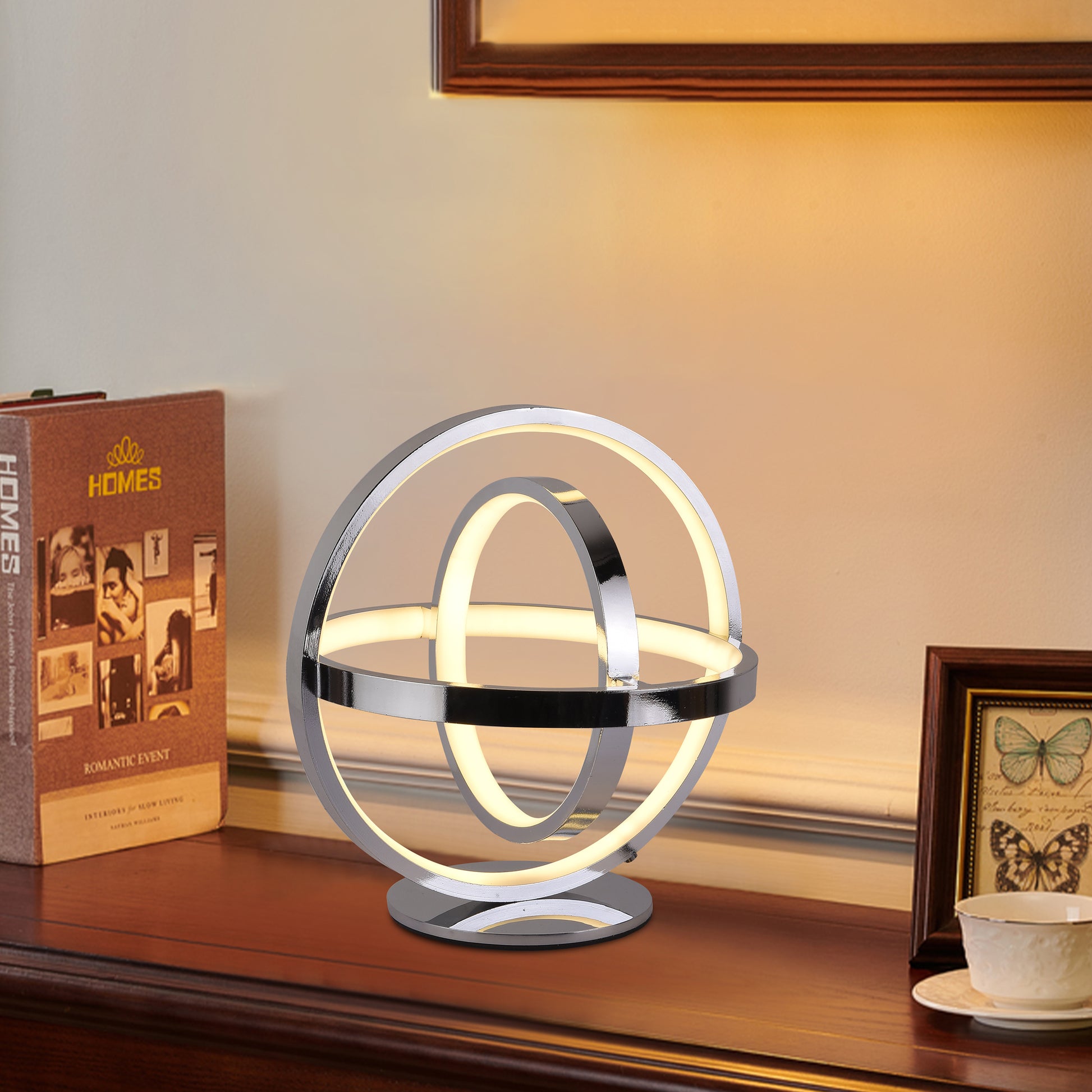 La lámpara de mesa LED GLOBE / TD416 combina diseño moderno y funcionalidad con un acabado en cromo brillante y un estilo inspirado en ondas espaciales y el planeta Tierra en órbita. Con luz cálida, neutra y blanca, regulador de intensidad y control alámbrico, permite crear un ambiente acogedor y adaptarlo a distintas necesidades, convirtiéndose en un accesorio decorativo elegante y versátil para cualquier hogar u oficina.