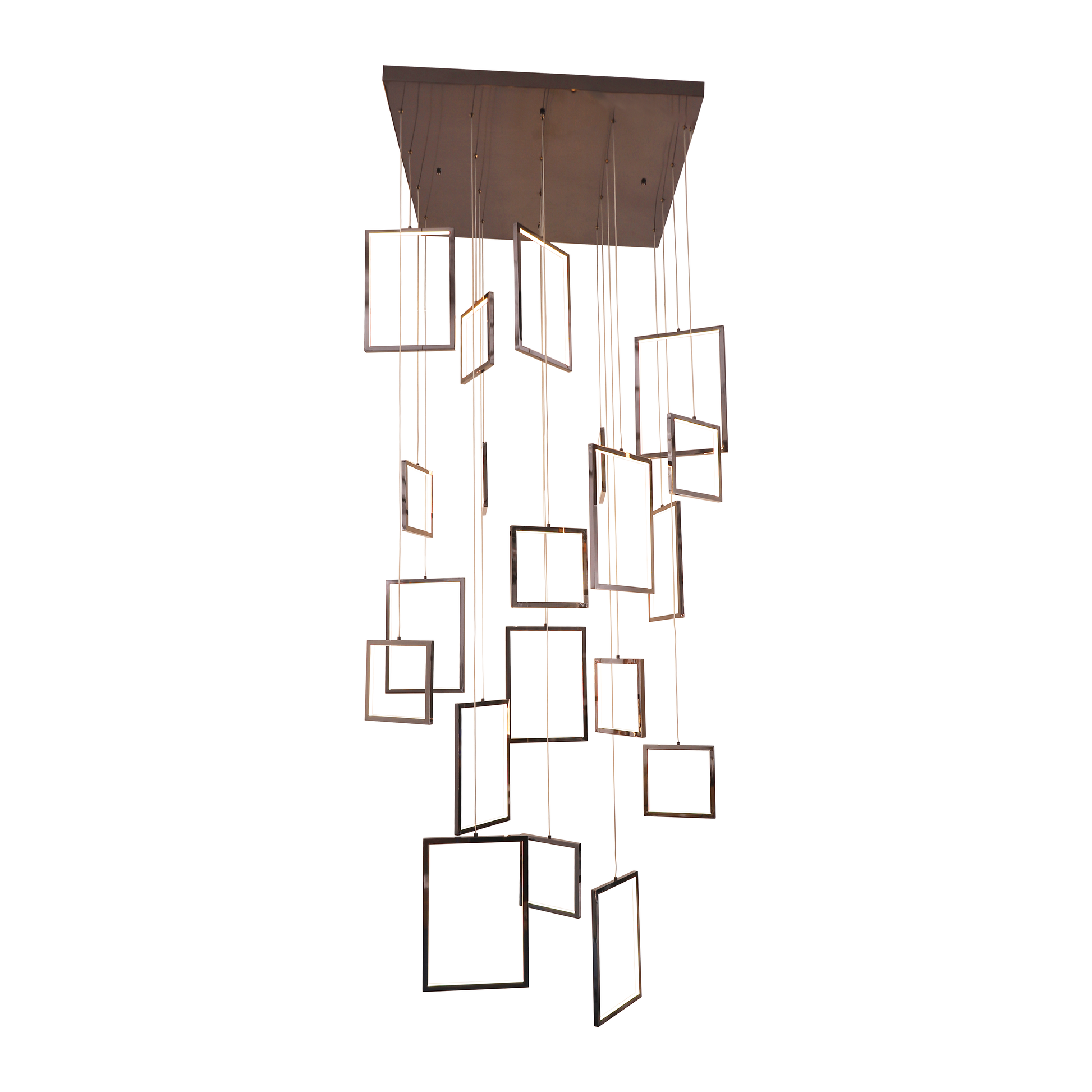 Una lámpara colgante que combina diseño artístico y tecnología inteligente. Con acabado en cromo negro reflectante, presenta 10 rectángulos y 10 cuadrados dispuestos de manera asimétrica, inspirados en marcos de arte moderno. Compatible con la app TUYA Smart y asistentes virtuales como Alexa y Google Assistant, permite un control práctico desde el móvil o por voz. Incluye control remoto para ajustar la intensidad y el color de la luz blanca, cálida o neutra adaptándose a cualquier ambiente. La ICON / AD17A ilumina tu espacio con estilo y sofisticación.