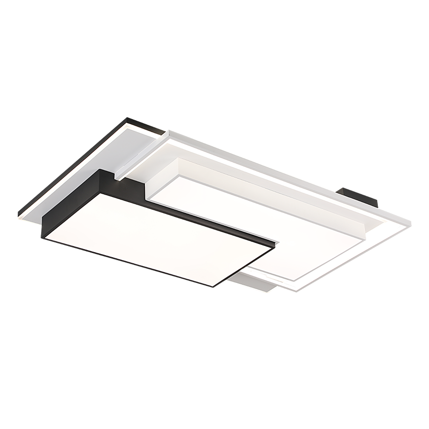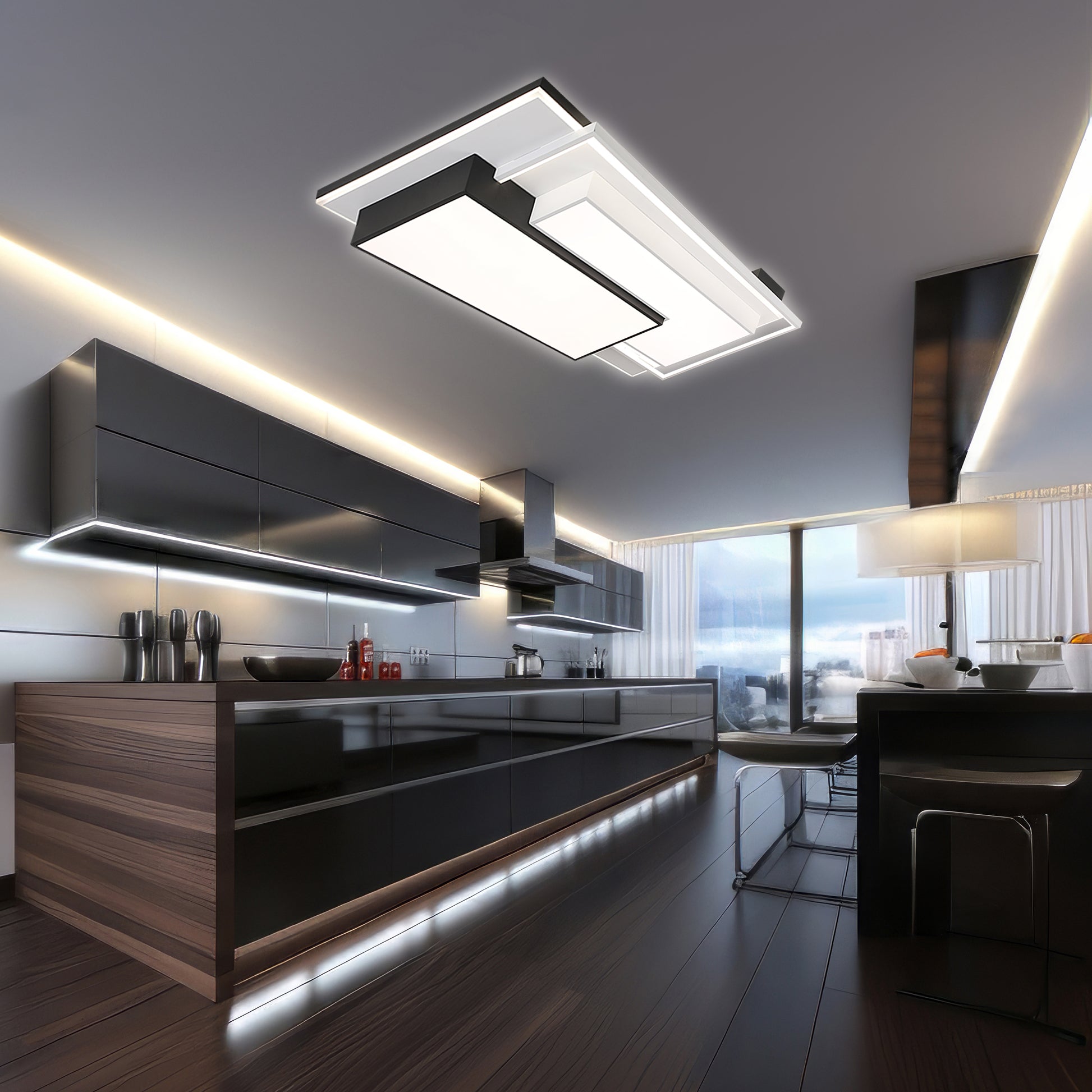 Plafón LED de gran formato con 4 rectángulos superpuestos en blanco y negro mate, con distintos perfiles y difusores lumínicos. Compatible con Tuya Smart App, Alexa y Google Assistant, incluye control remoto. Luz ajustable en blanca, cálida y neutra, ideal para habitaciones que buscan un estilo moderno y minimalista.