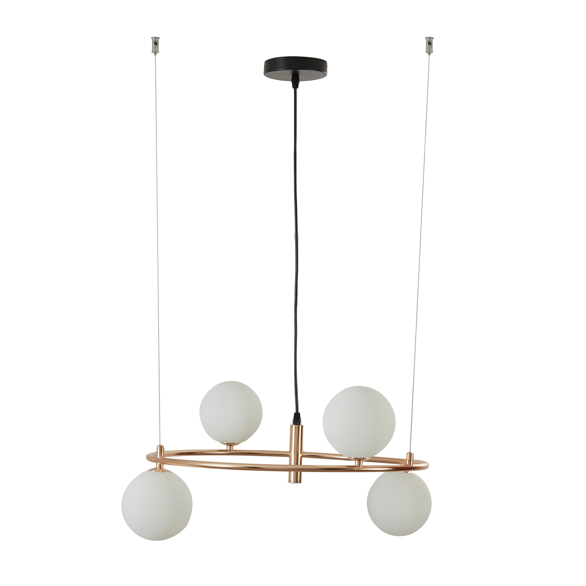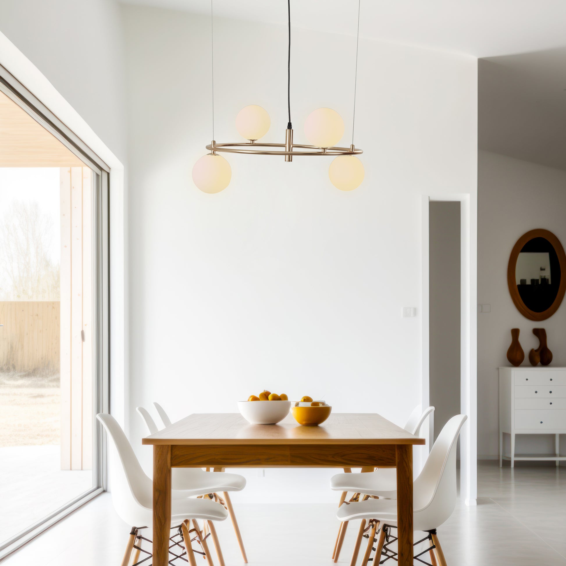 La lámpara circular KLAS / 8151 combina elegancia y modernidad con su acabado en oro francés y 4 esferas de vidrio blanco opalino mate que difunden una luz suave y acogedora. Inspirada en el anillo de matrimonio, aporta un toque romántico y sofisticado, perfecta para salas, comedores o dormitorios, convirtiéndose en una pieza decorativa destacada en cualquier espacio.