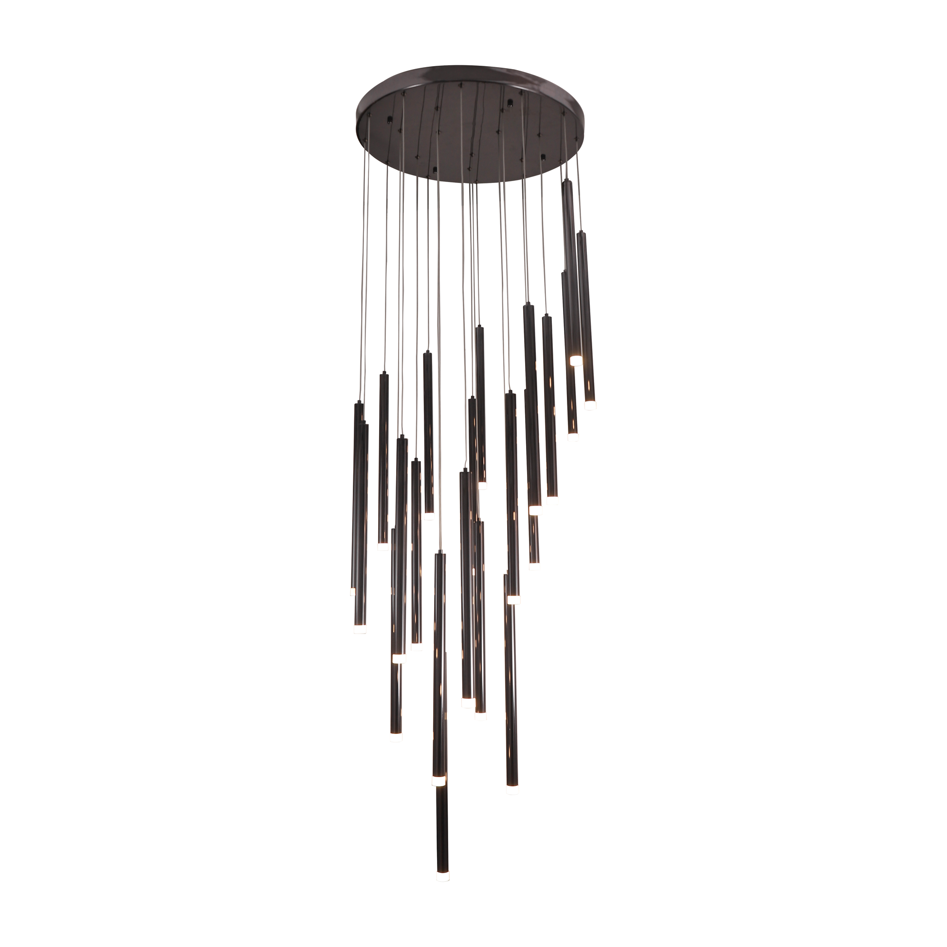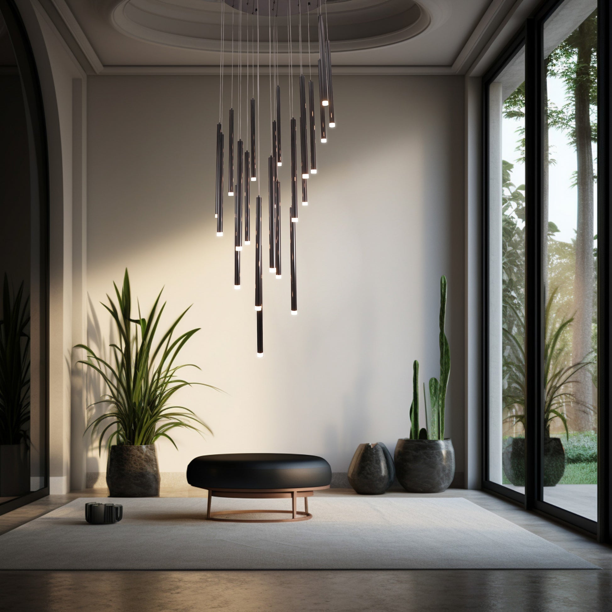 Una lámpara de diseño moderno y elegante que combina 22 luces cilíndricas en acabado cromo negro reflectante, inspiradas en una lluvia astral infinita. Compatible con la app TUYA Smart y asistentes virtuales como Alexa y Google Assistant, permite un control práctico desde el móvil o por voz. Ofrece luz blanca, cálida y neutra, con la posibilidad de ajustar su intensidad mediante control remoto. Su diseño para doble altura la convierte en una pieza imponente y sofisticada, perfecta para realzar cualquier espacio.