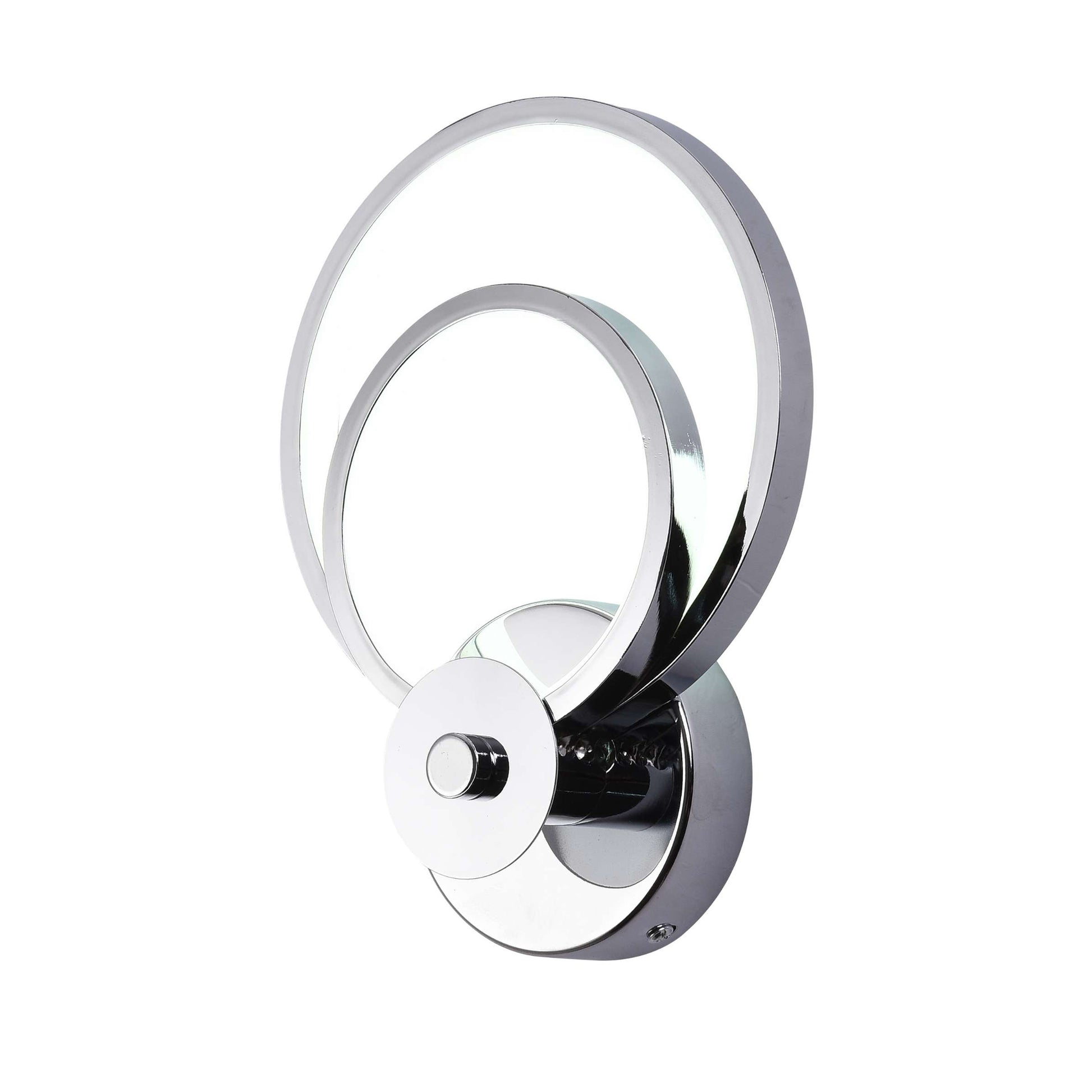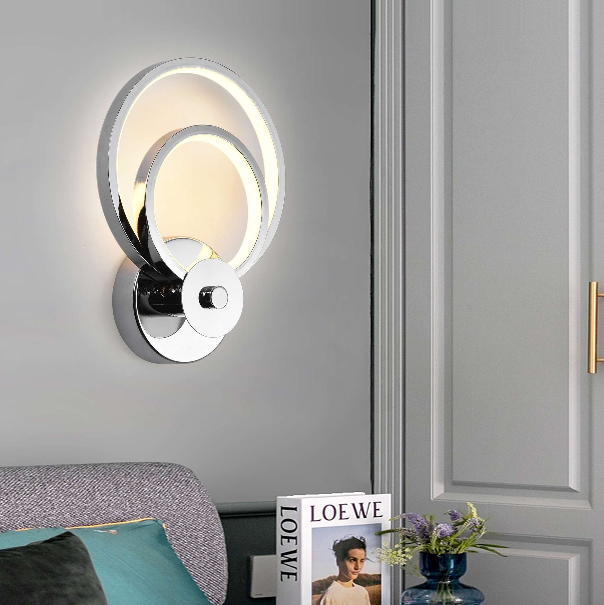 Aplique de pared LED moderno con anillos de distintos tamaños en aluminio, sostenidos por una base redonda. Diseño contemporáneo y elegante, ideal para cualquier espacio del hogar.