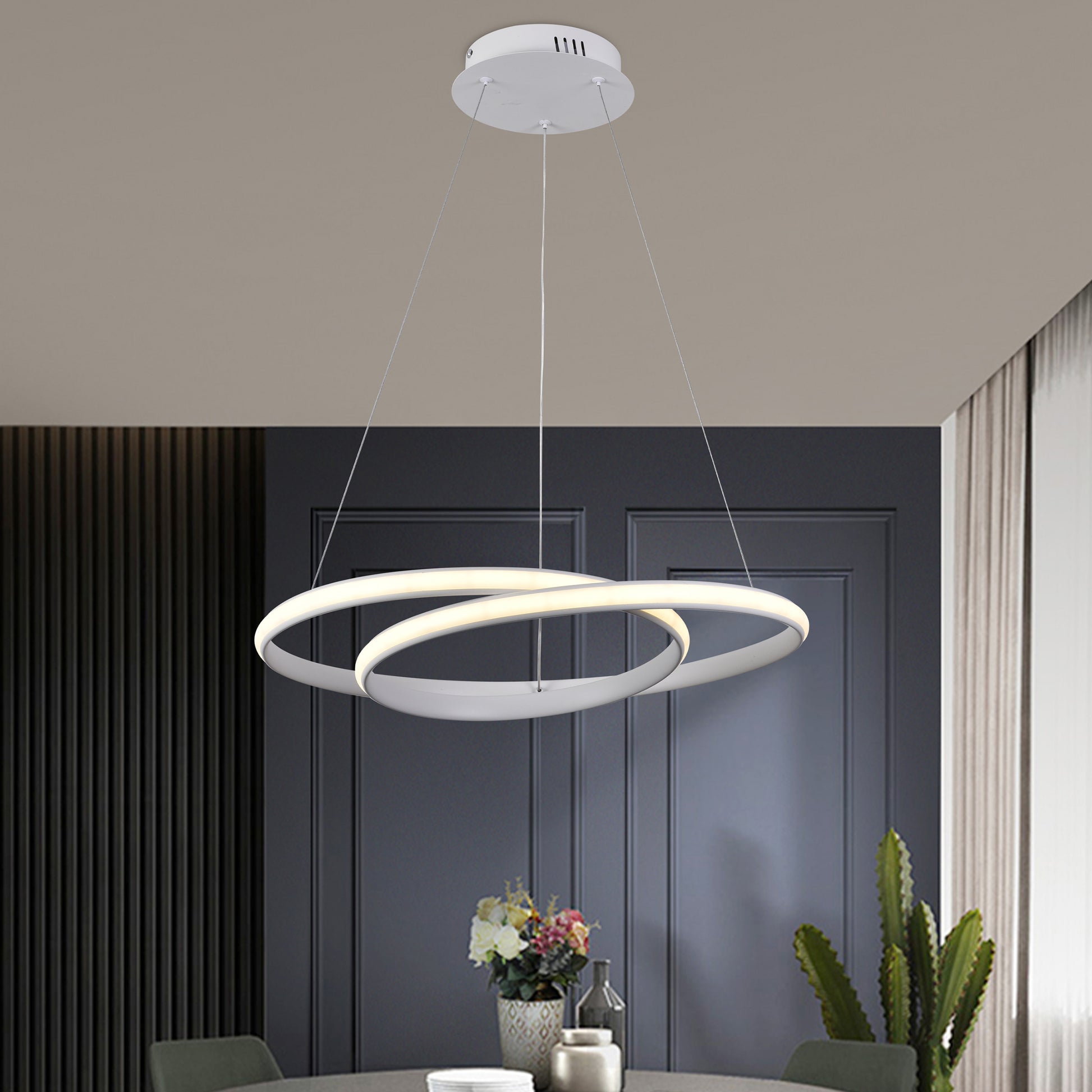 La lámpara colgante RINGS / 6127 combina elegancia y modernidad con dos aros de aluminio entrelazados que crean un efecto dinámico y sofisticado. Su diseño con LEDs integrados ofrece iluminación regulable en intensidad y temperatura de color mediante control remoto y app, adaptándose a cualquier ambiente. Un detalle versátil y moderno que transforma instantáneamente salas, comedores o entradas.