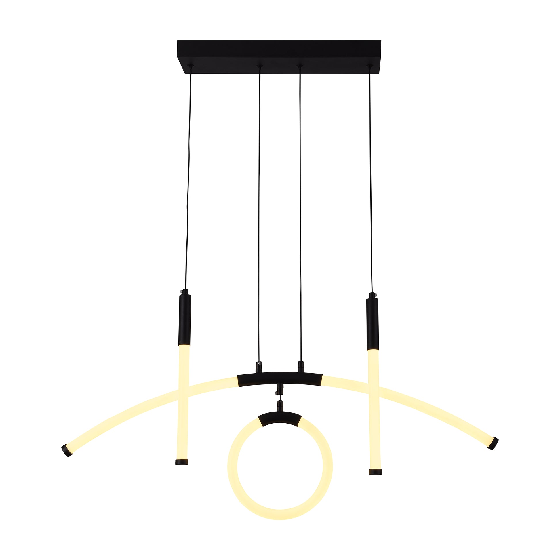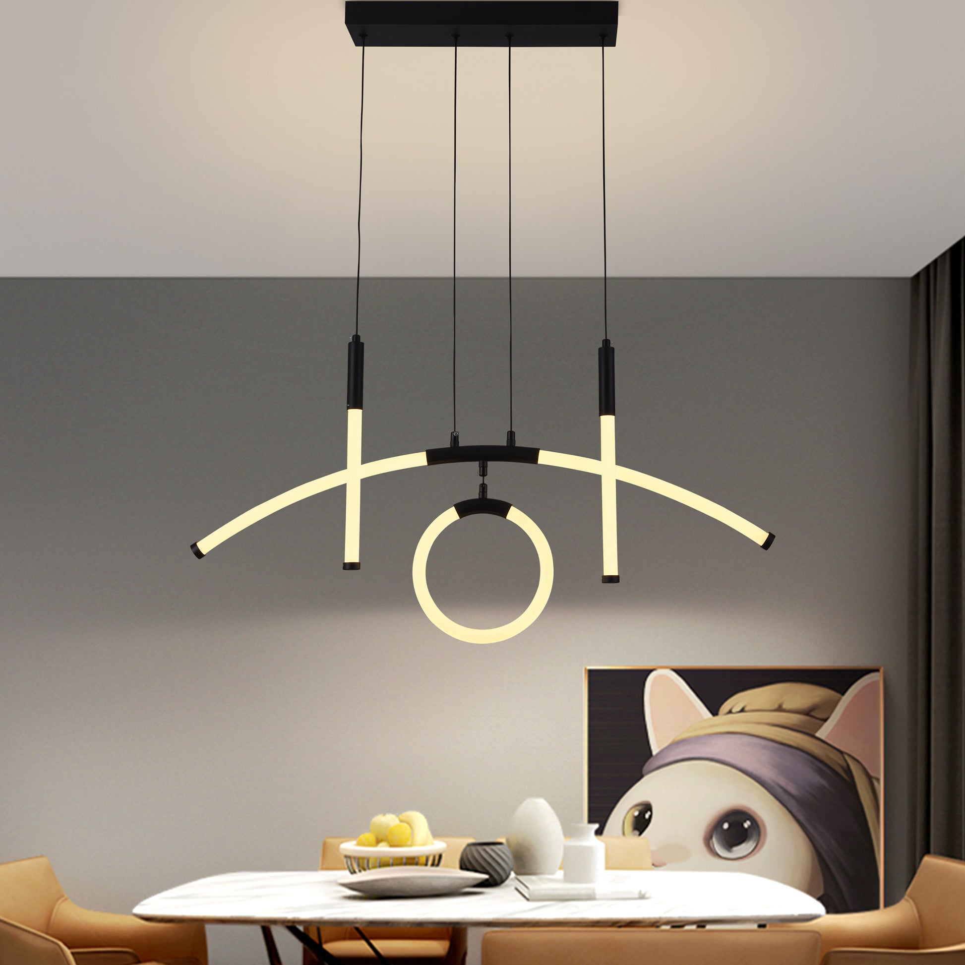 Shol es un candelabro colgante LED moderno y sofisticado que combina un aro central sobrepuesto en una media luna, creando un diseño original y llamativo. Su iluminación se distribuye en todas las direcciones y es completamente regulable en intensidad y temperatura de color mediante control remoto, convirtiéndose en una pieza elegante y versátil para cualquier espacio contemporáneo.