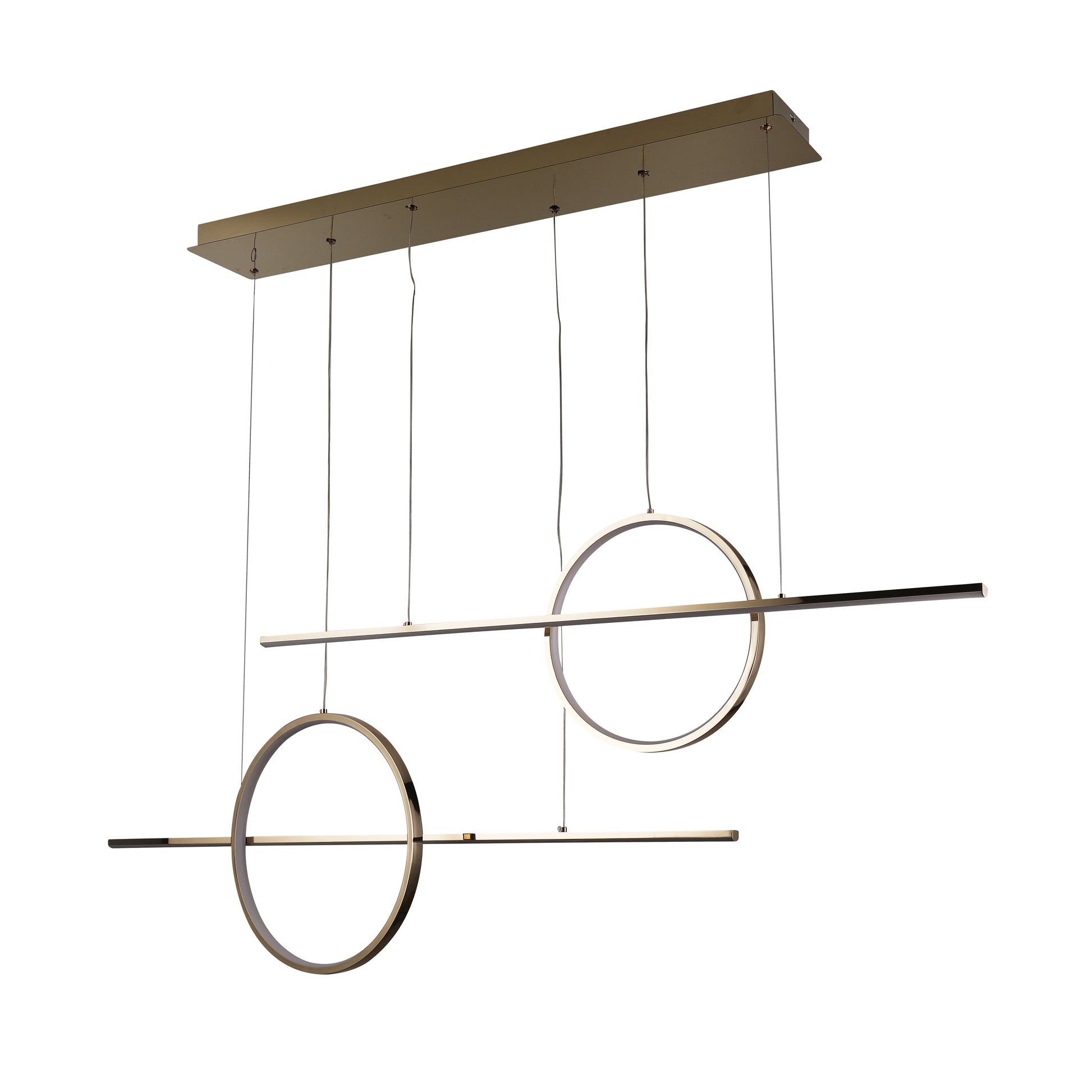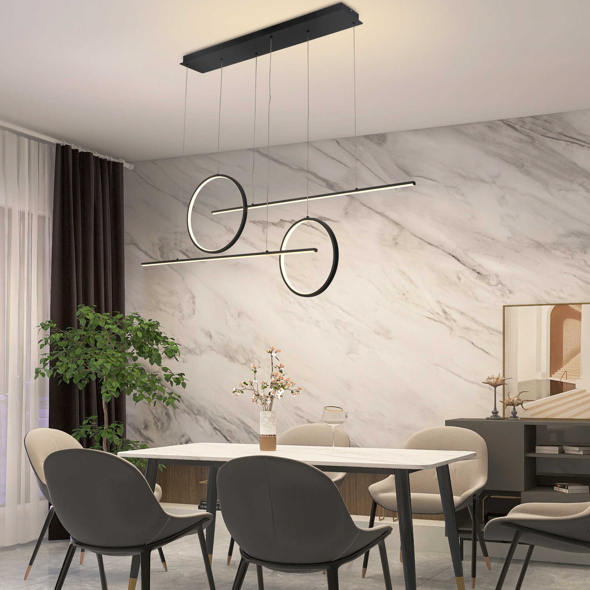La lámpara colgante SOLE es un candelabro LED lineal de 4 luces con diseño minimalista y moderno. Sus tubos y aros son ajustables en altura, y ofrece control remoto y app para atenuar la luz blanca, cálida o neutra. Disponible en acabados cromo, negro y dorado, aporta estilo y funcionalidad a salas, comedores, oficinas o dormitorios.