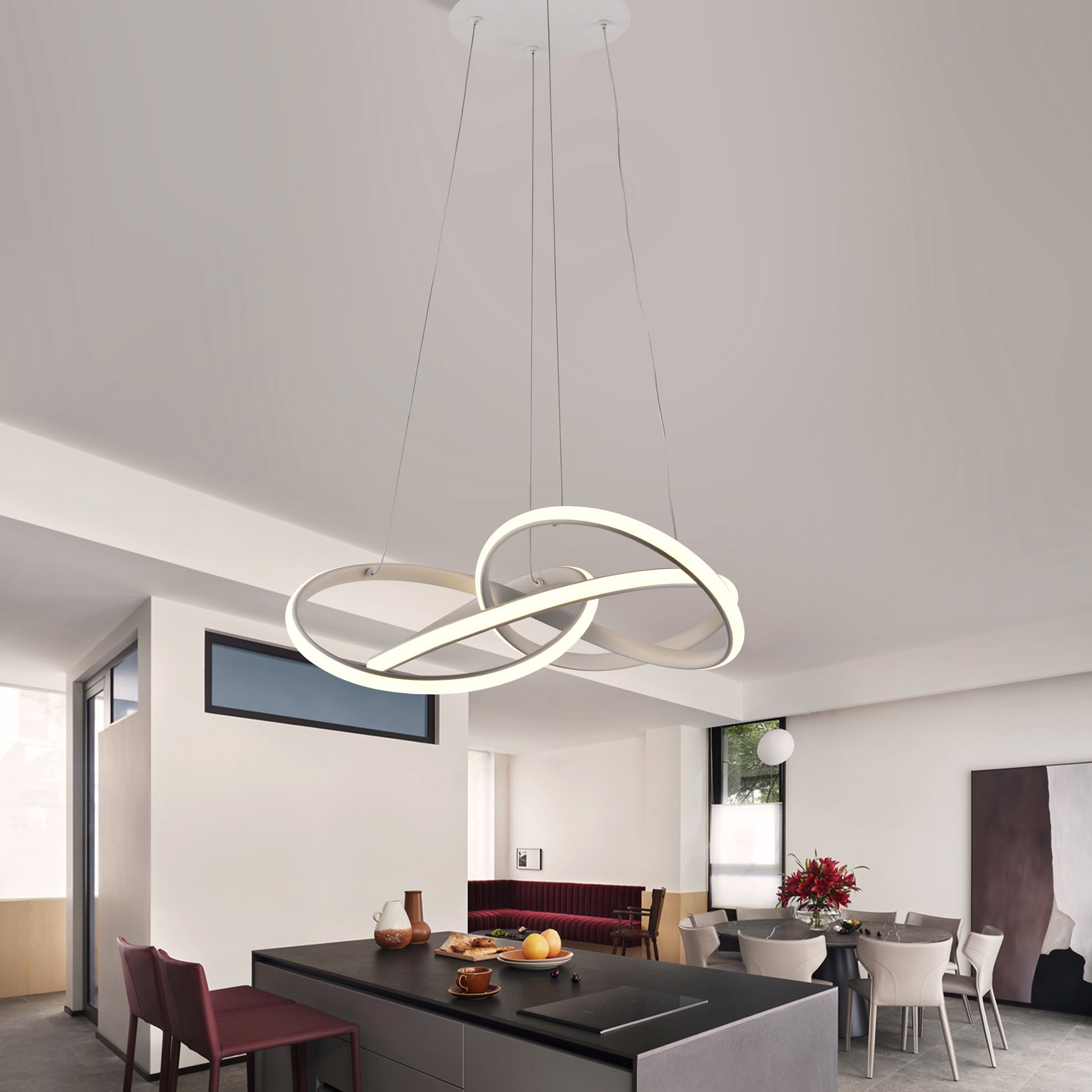El colgante SPACE / 6141 fusiona iluminación y arte escultórico en un solo diseño. Sus líneas curvas y rizadas en movimiento continuo crean una presencia elegante y dinámica, disponible en acabados dorado, cromo, negro y blanco. Más que una lámpara, es una pieza decorativa que transforma cualquier ambiente. Su luz LED regulable se proyecta en todas las direcciones, generando un efecto dramático y envolvente, perfecto para realzar salas, comedores o entradas con un estilo moderno y sofisticado.