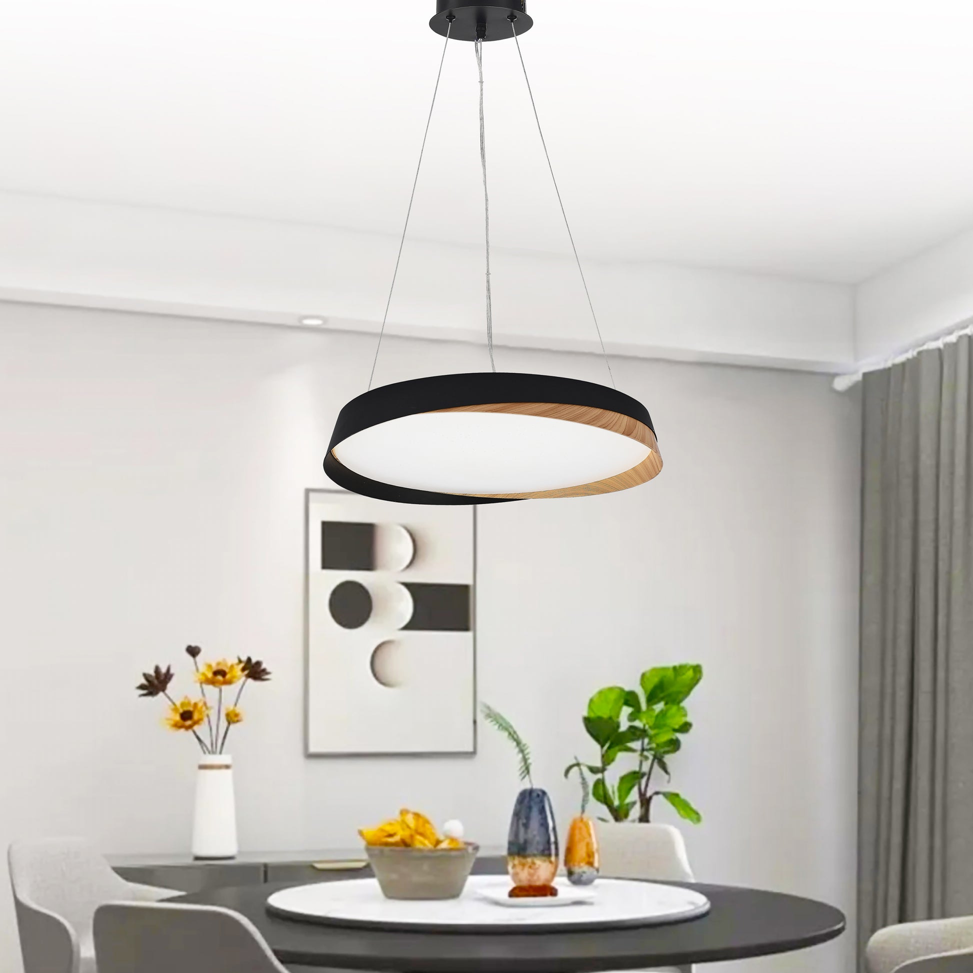 La lámpara STURA / 2394 combina diseño minimalista y elegancia con acabados en negro mate y madera nogal. Inspirada en formas cósmicas y galácticas, esta luminaria ofrece luz blanca, cálida y neutra, ajustable fácilmente mediante control remoto o aplicación móvil. Perfecta para crear un ambiente moderno, sofisticado y lleno de personalidad en cualquier espacio.