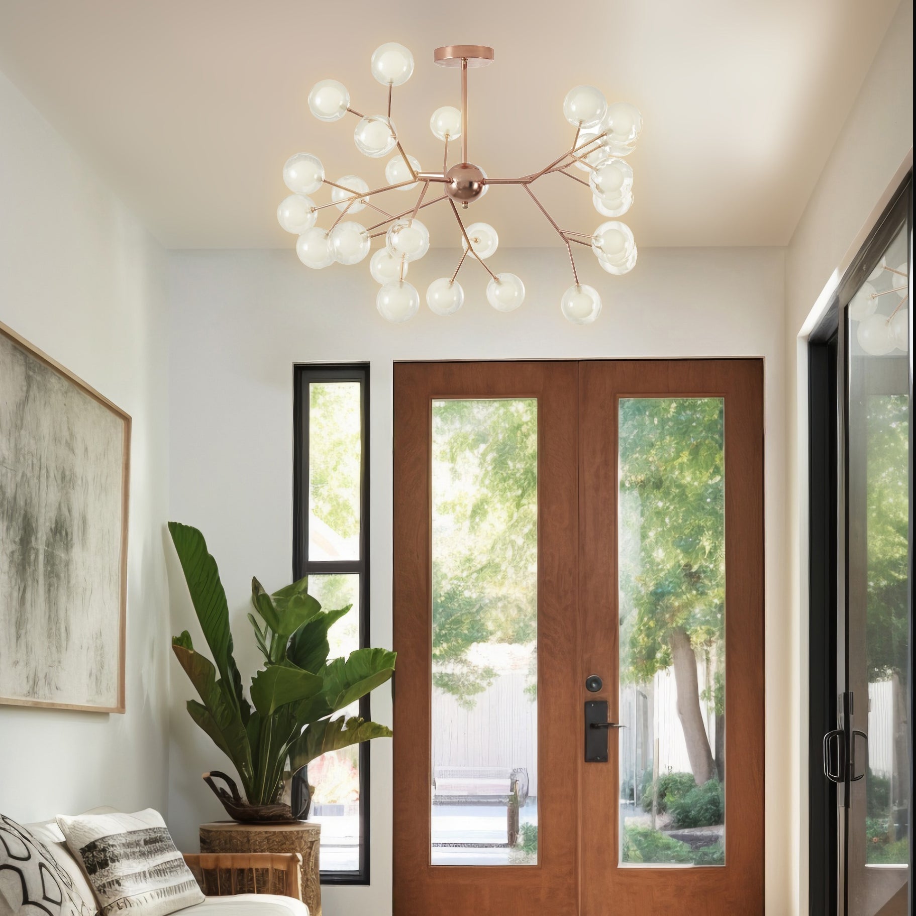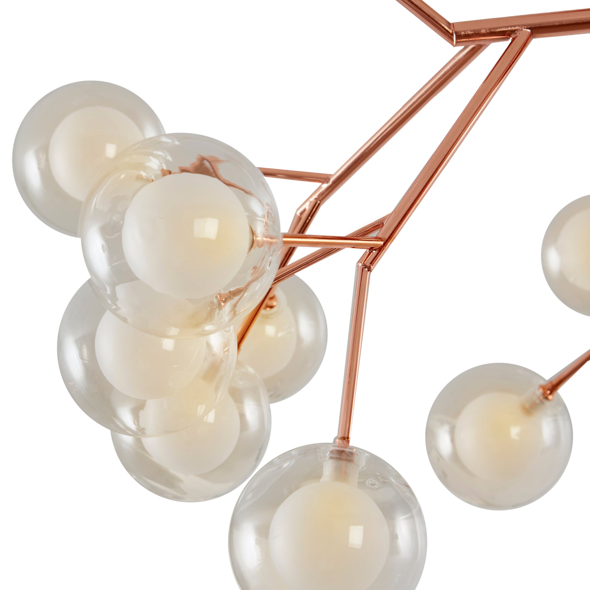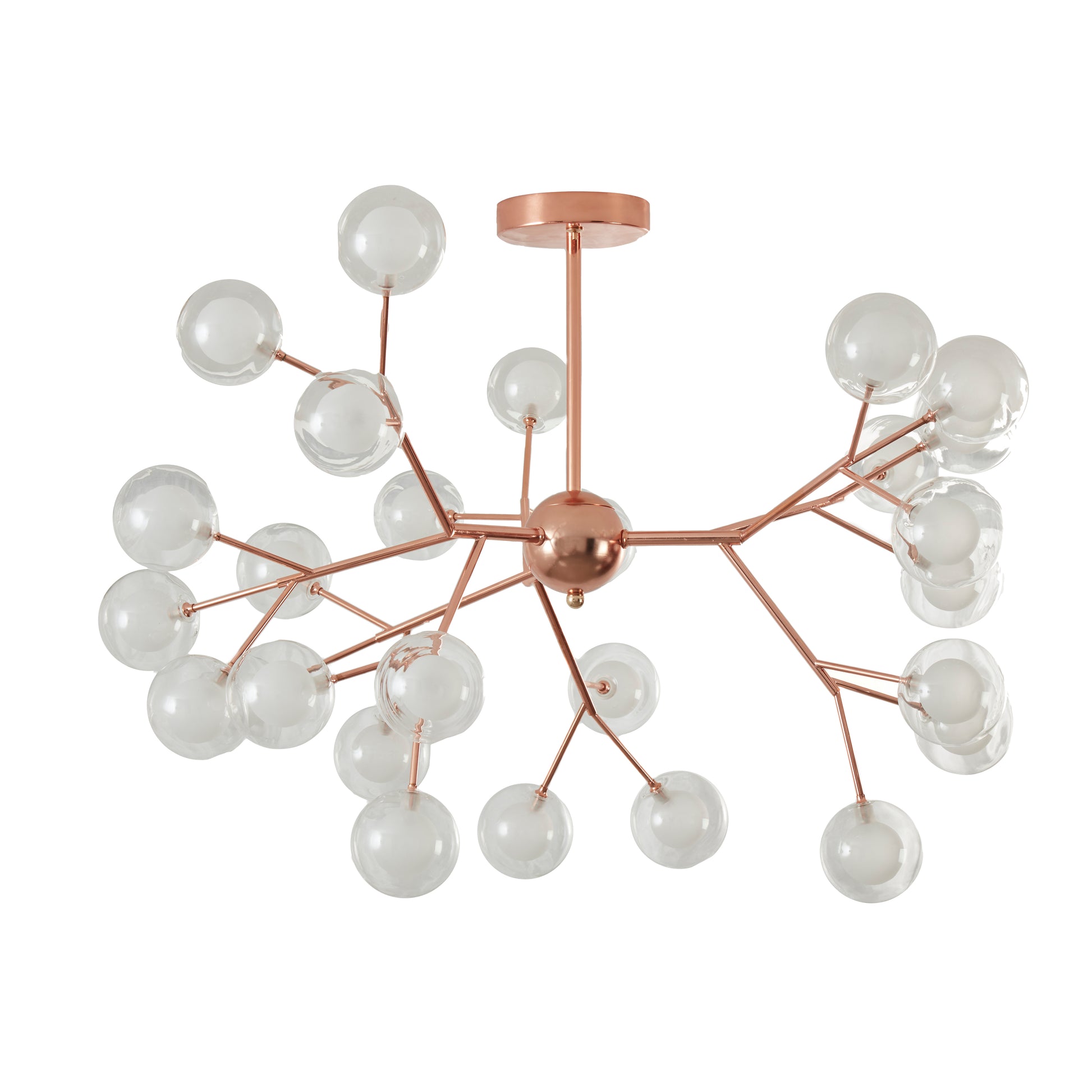 La lámpara colgante TARA evoca un árbol genealógico con sus 27 esferas transparentes con interior opalino, simbolizando los frutos de la vida. Con un elegante acabado en oro rosado, su diseño único y sofisticado aporta un toque de estilo y distinción a cualquier espacio, convirtiéndose en el centro de atención de tu decoración.