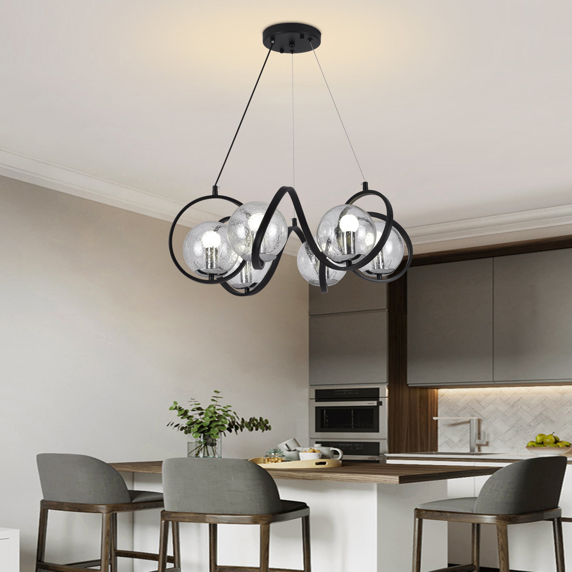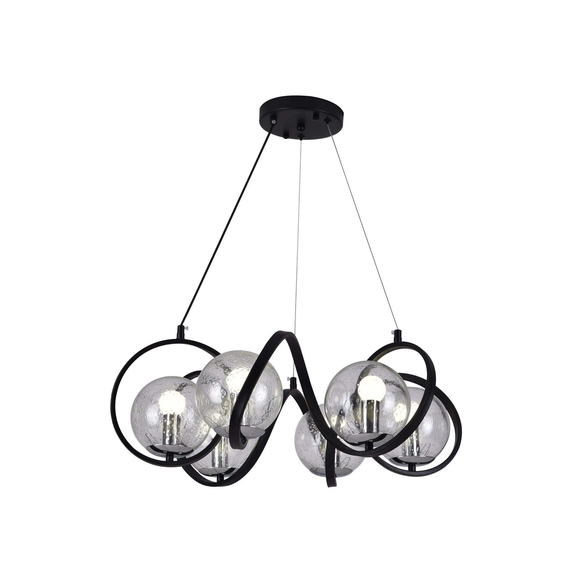 La lámpara colgante TENDO presenta un encantador diseño de burbujas alineadas en cĂrculo, combinando modernidad y estilo clásico. Ideal para salas de estar, comedores, cocinas, entradas y vestĂbulos, este candelabro de 6 luces está fabricado en metal duradero y cuenta con un dosel negro en espiral que armoniza con sus bases cromadas. Cada base remata con una pantalla de cristal globo transparente con burbujas, creando un efecto visual sofisticado y acogedor en cualquier espacio.