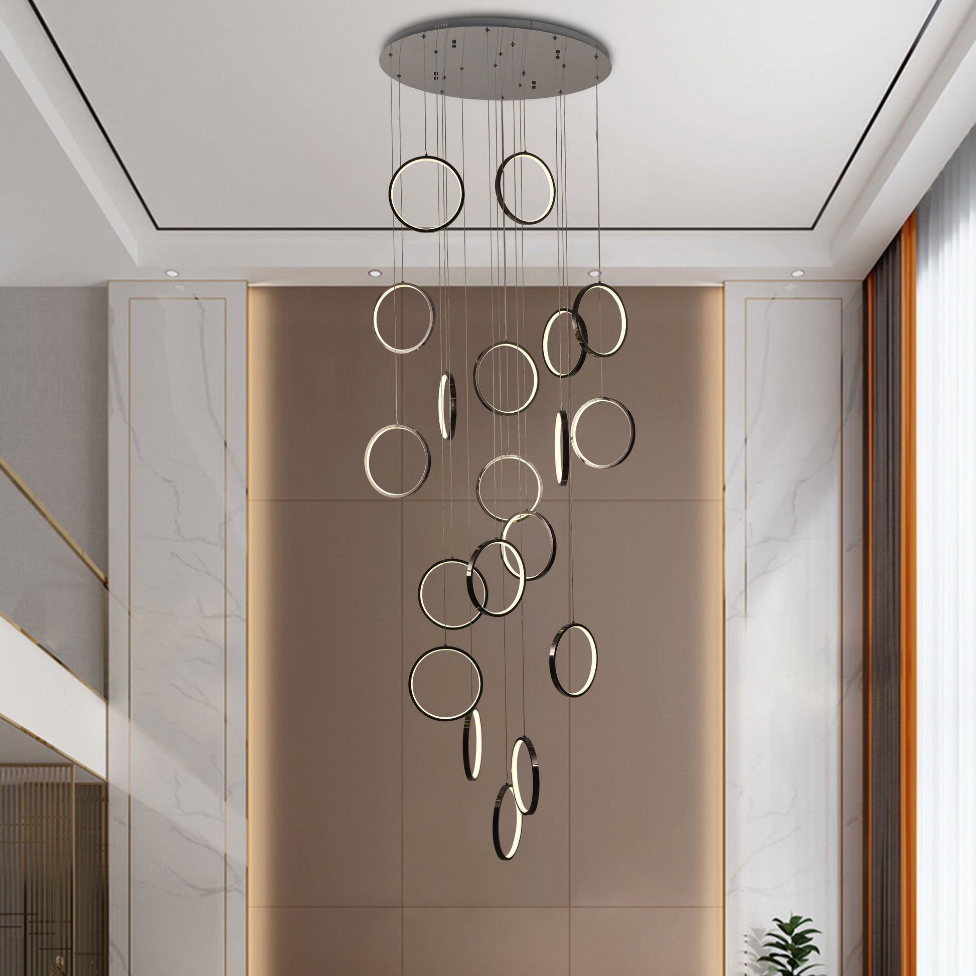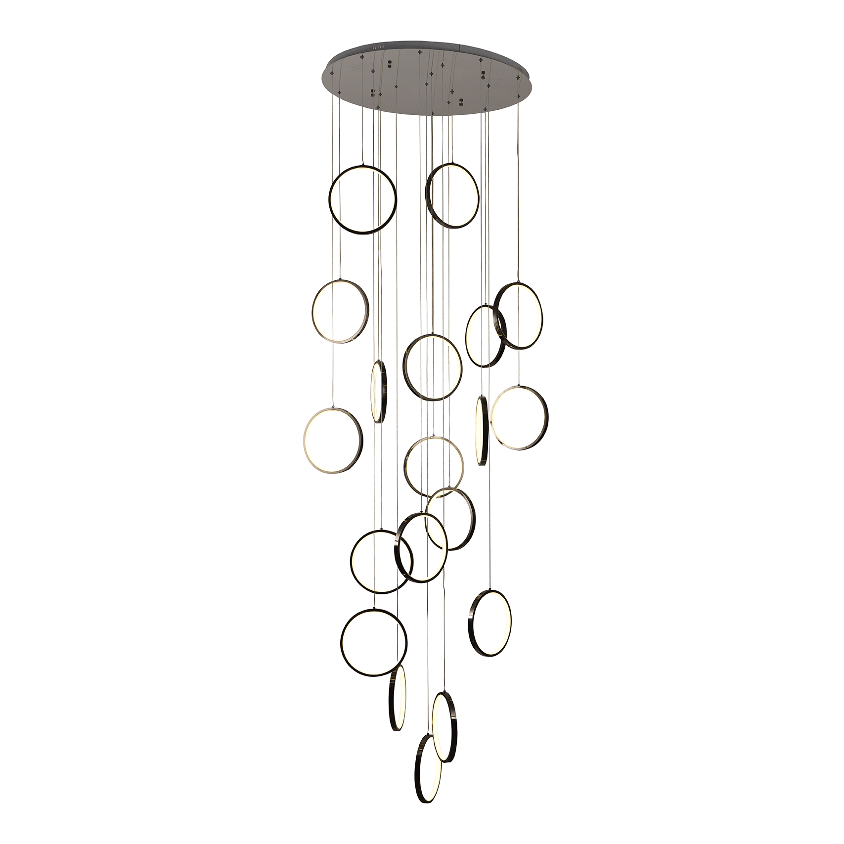 Una lámpara suspendida LED exclusiva, diseñada para realzar espacios de doble altura con un estilo moderno y sofisticado. Su acabado en cromo negro y sus 19 aros conforman una escultura luminosa imponente que transforma cualquier ambiente. Compatible con la app TUYA Smart y asistentes virtuales como Alexa y Google Assistant, permite un control inteligente desde el móvil o por voz. Incluye control remoto para ajustar entre luz blanca, cálida y neutra, ofreciendo versatilidad y confort en cada ocasión. La TOKIO / LCD8029 combina calidad, modernidad y tecnología para destacar en tu decoración.
