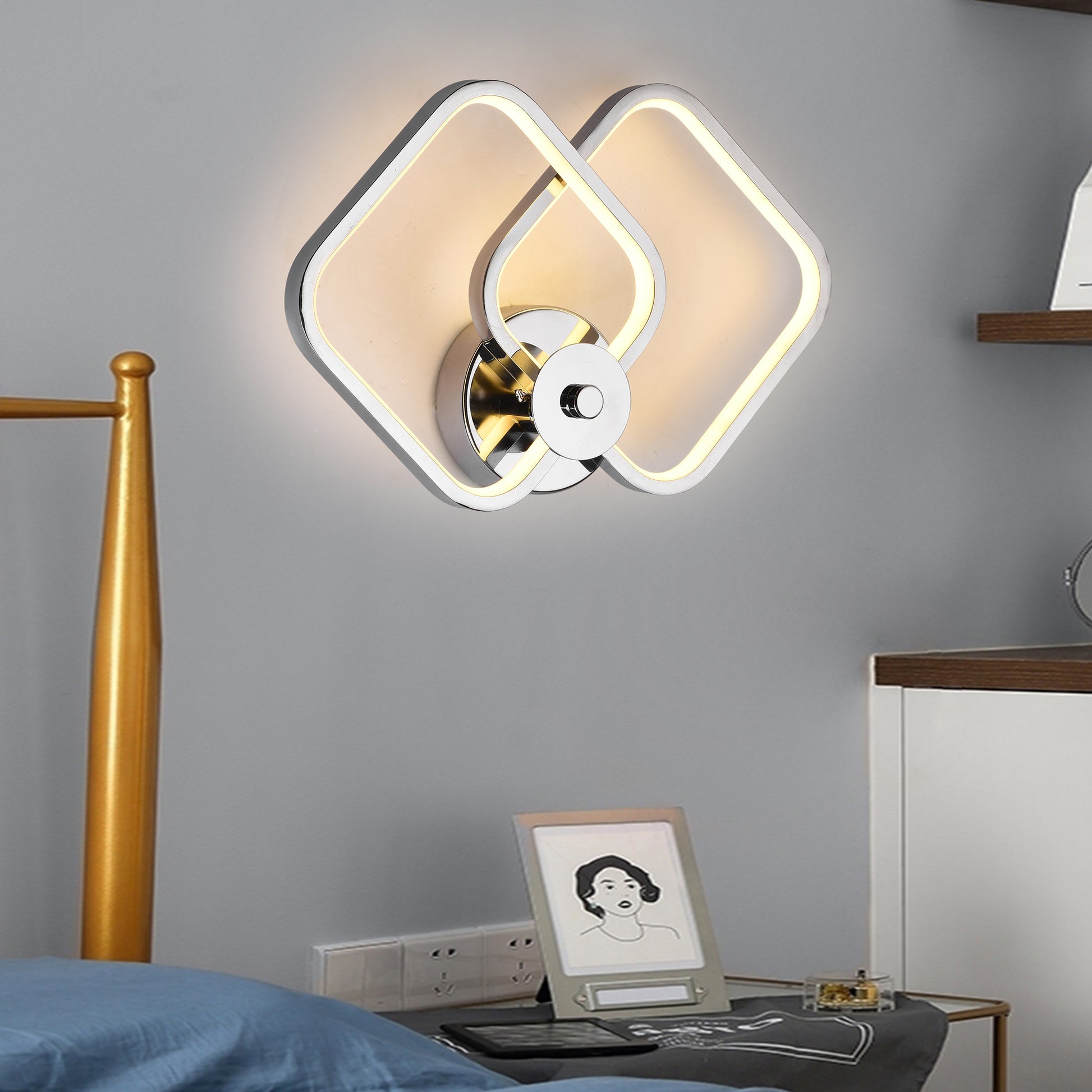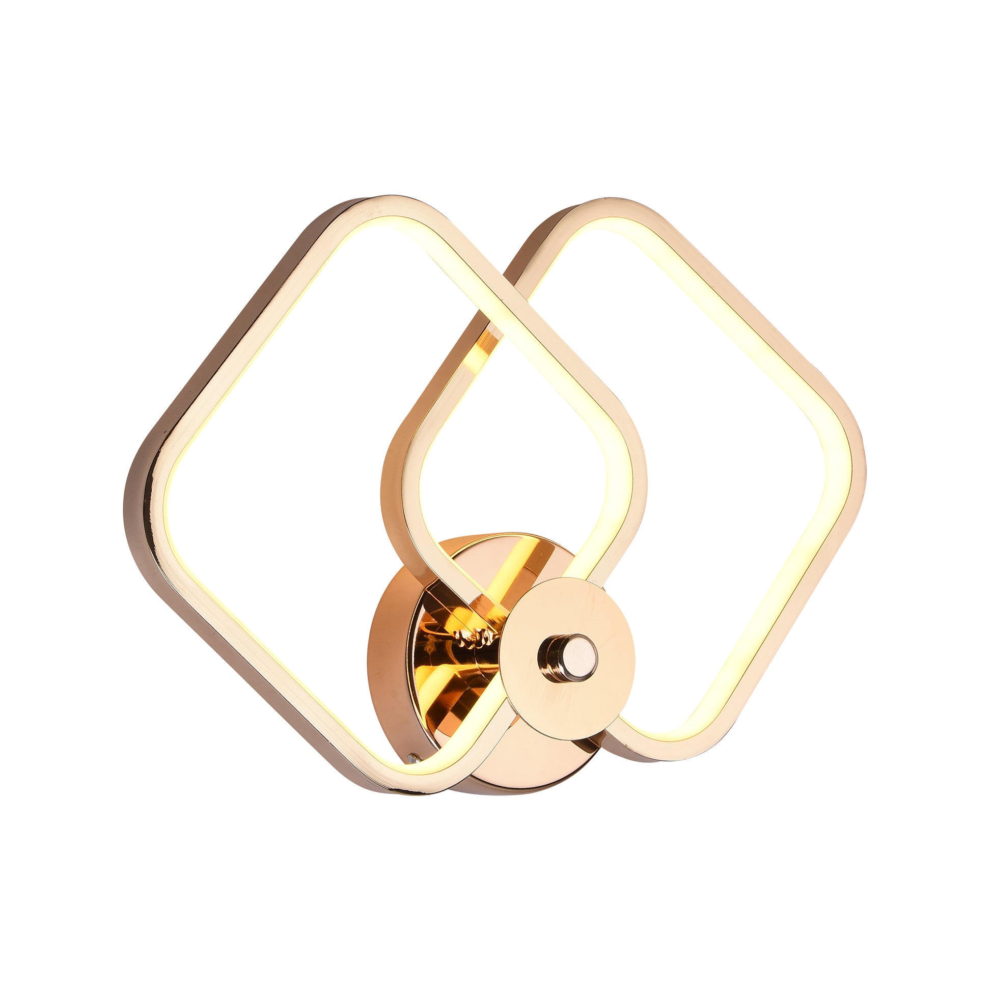 Aplique de pared LED moderno con cuadros de aluminio sobrepuestos e iluminados internamente. Complementa la colección de candiles colgantes con un estilo contemporáneo y aerodinámico.
