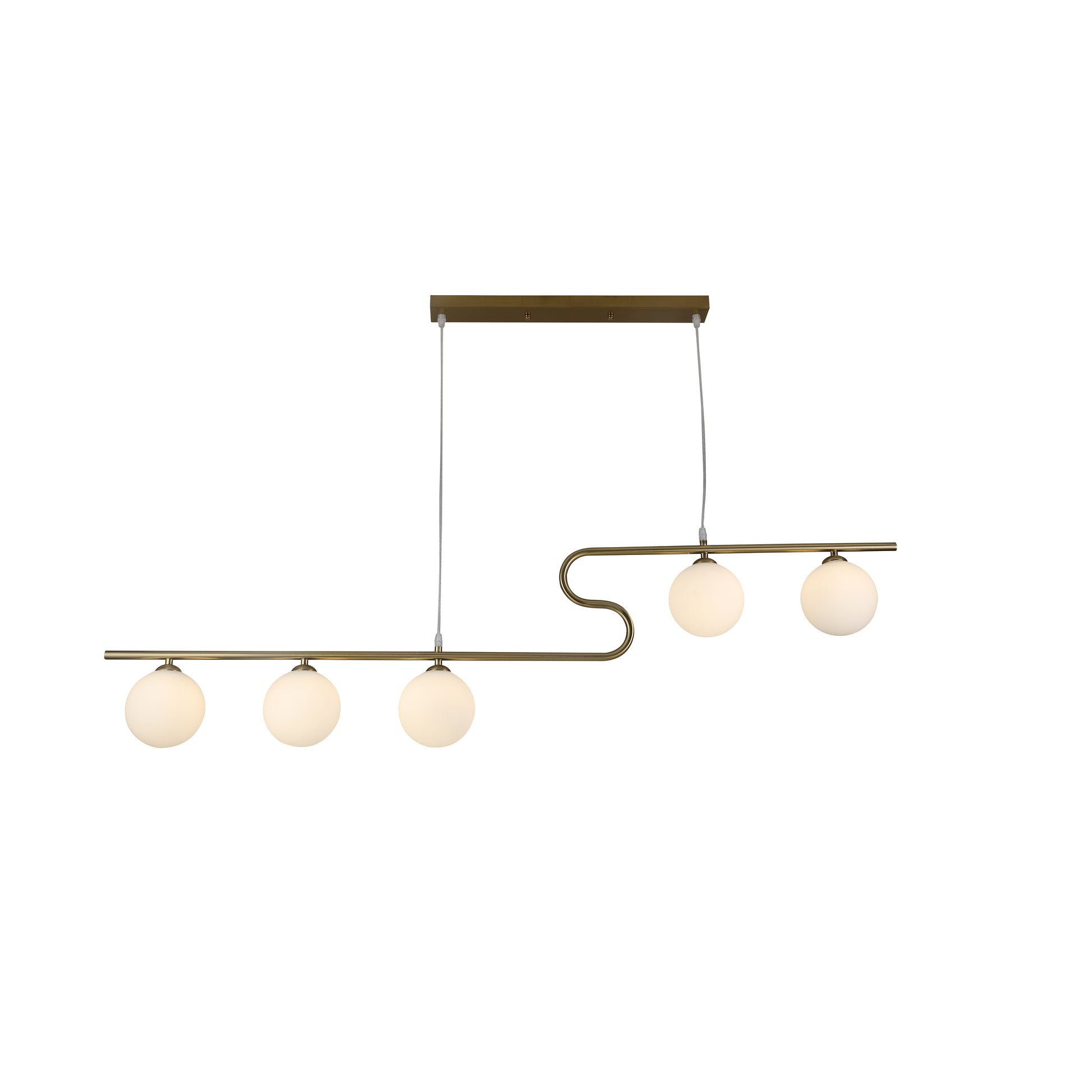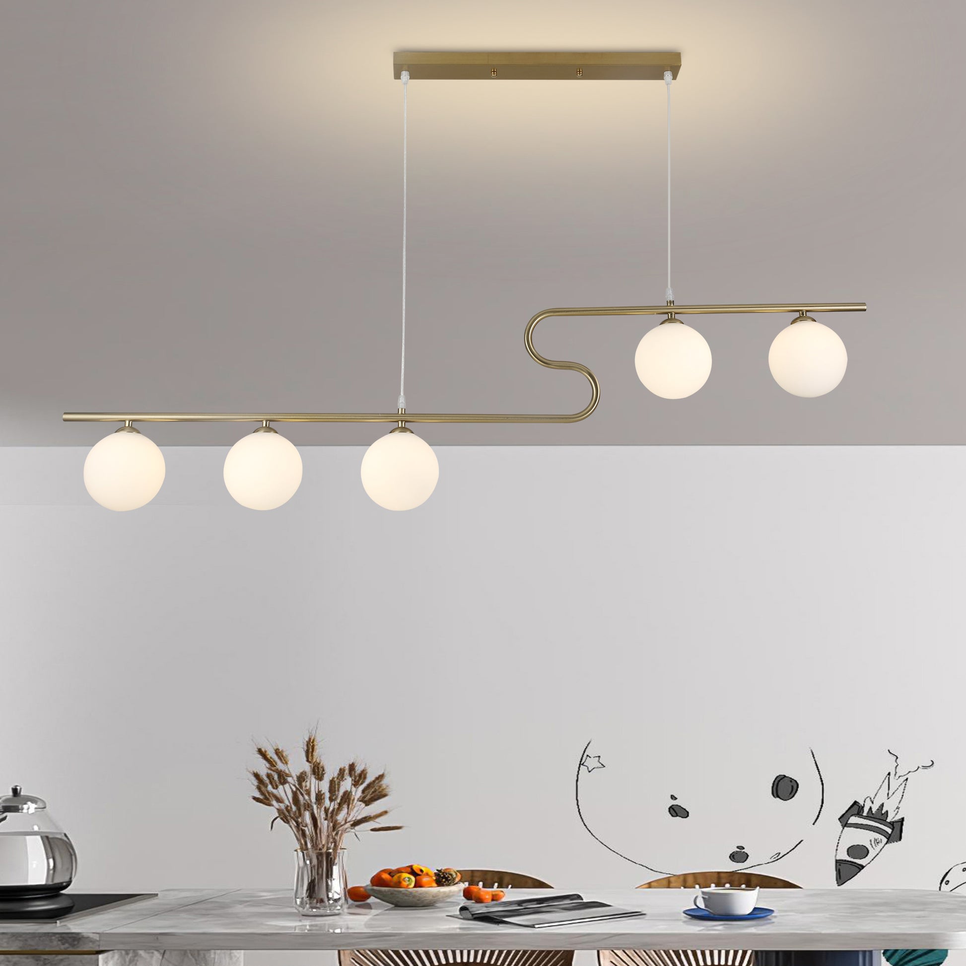 La lámpara colgante VIGGIO presenta 5 esferas de vidrio blanco opalino que combinan funcionalidad y arte, ofreciendo una iluminación de múltiples perspectivas ideal para cualquier espacio moderno. Su diseño dinámico permite que también funcione como una pieza de arte abstracta, agregando personalidad y estilo a la habitación. Con altura ajustable, se puede colocar cerca del techo o más colgada según tus necesidades, haciendo de VIGGIO una opción elegante y versátil para salas de estar, escaleras o entradas.