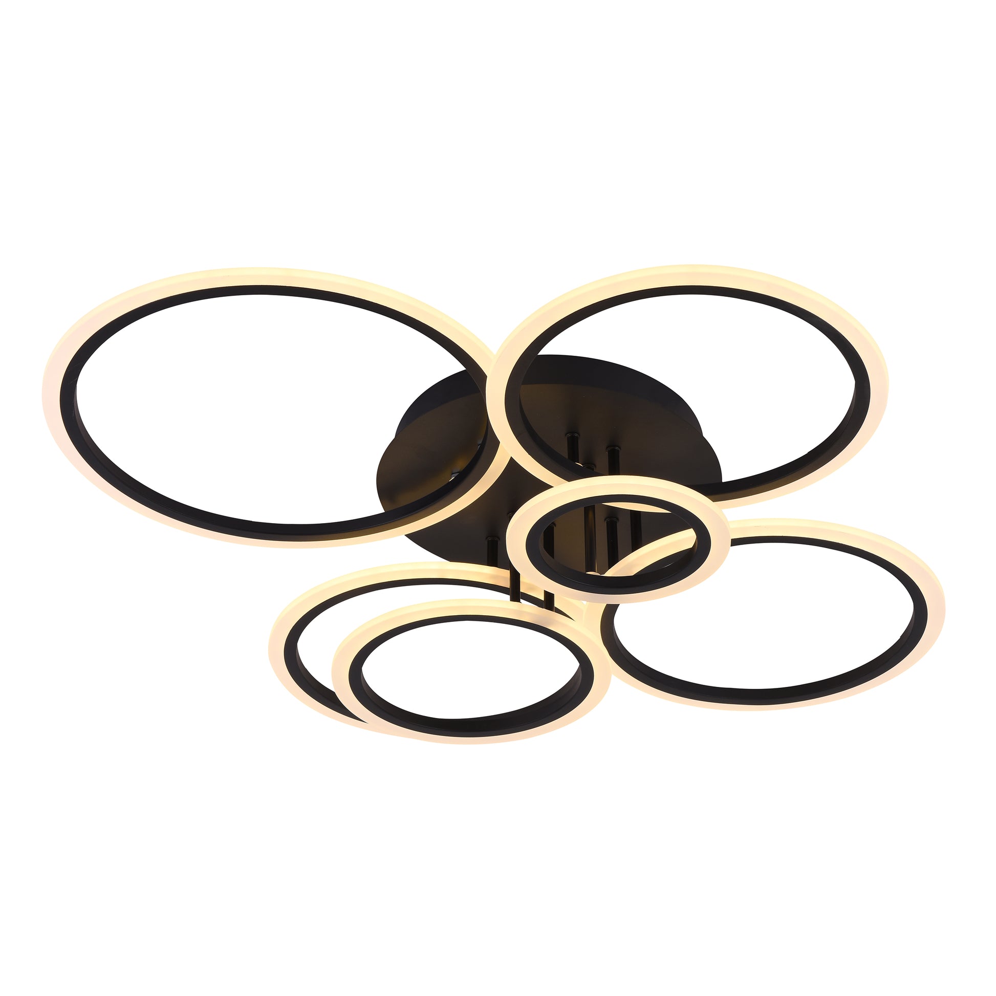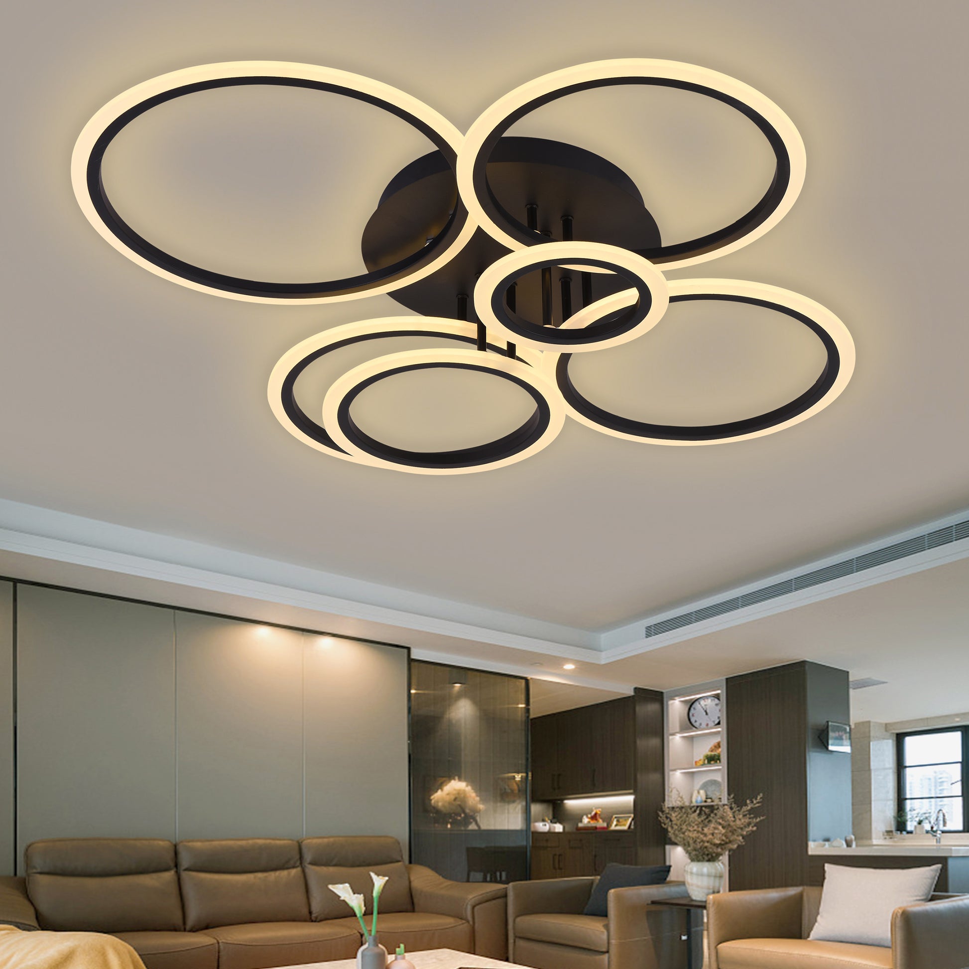 La lámpara de techo LED WAVE / 6803-06 combina diseño moderno y sofisticación con anillos de distintos tamaños en acabado negro mate sostenidos por una columna de aluminio que crea una caída suave. Con control remoto, regulador de intensidad y tres temperaturas de luz, ofrece una iluminación versátil y elegante, convirtiéndose en un complemento contemporáneo ideal para cualquier espacio del hogar.