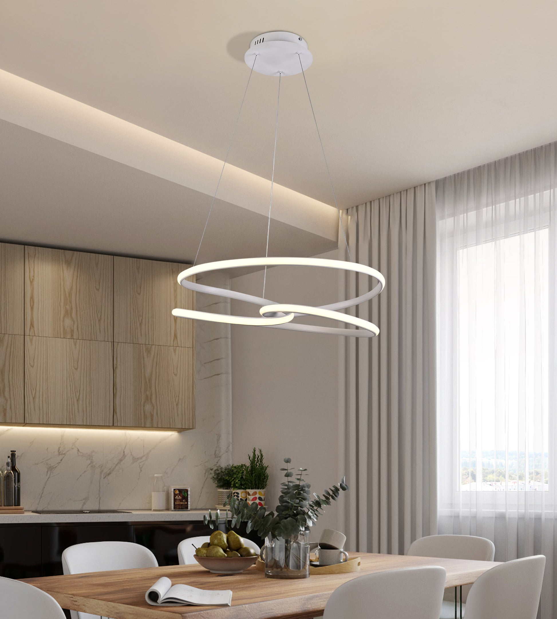 La lámpara colgante WINGS / 6115 destaca por su diseño moderno y elegante, compuesto por anillos simples entrelazados al centro mediante un perfil de aluminio. Disponible en negro mate, blanco mate, dorado y cromado, esta pieza minimalista se complementa con un difusor LED de silica gel que proporciona una luz descendente suave y agradable. Con control remoto y funciones regulables de intensidad y temperatura de color, WINGS / 6115 combina estilo y funcionalidad, convirtiéndose en el toque perfecto para cualquier espacio contemporáneo.