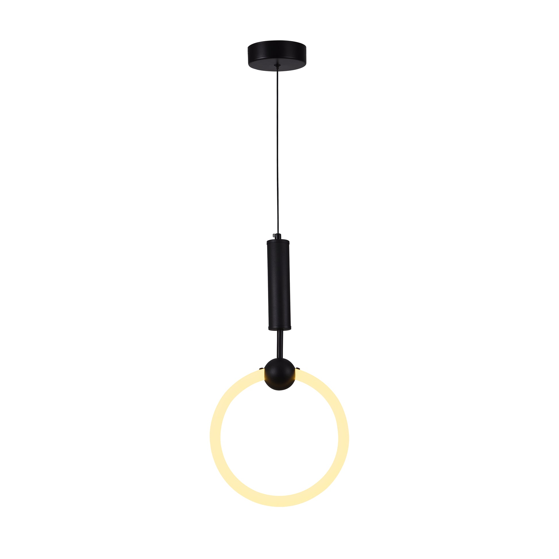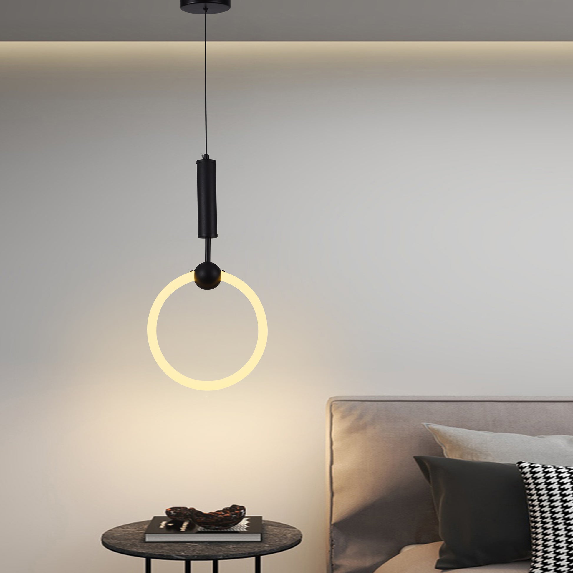 Lámpara colgante LED de diseño moderno con 3 cambios de luz y altura regulable. Con un marco de aluminio en acabado negro mate y perfiles circulares de PC opalino, THEO combina estilo y funcionalidad. Su luz proyecta un brillo radiante, creando un ambiente moderno y acogedor en cualquier espacio.