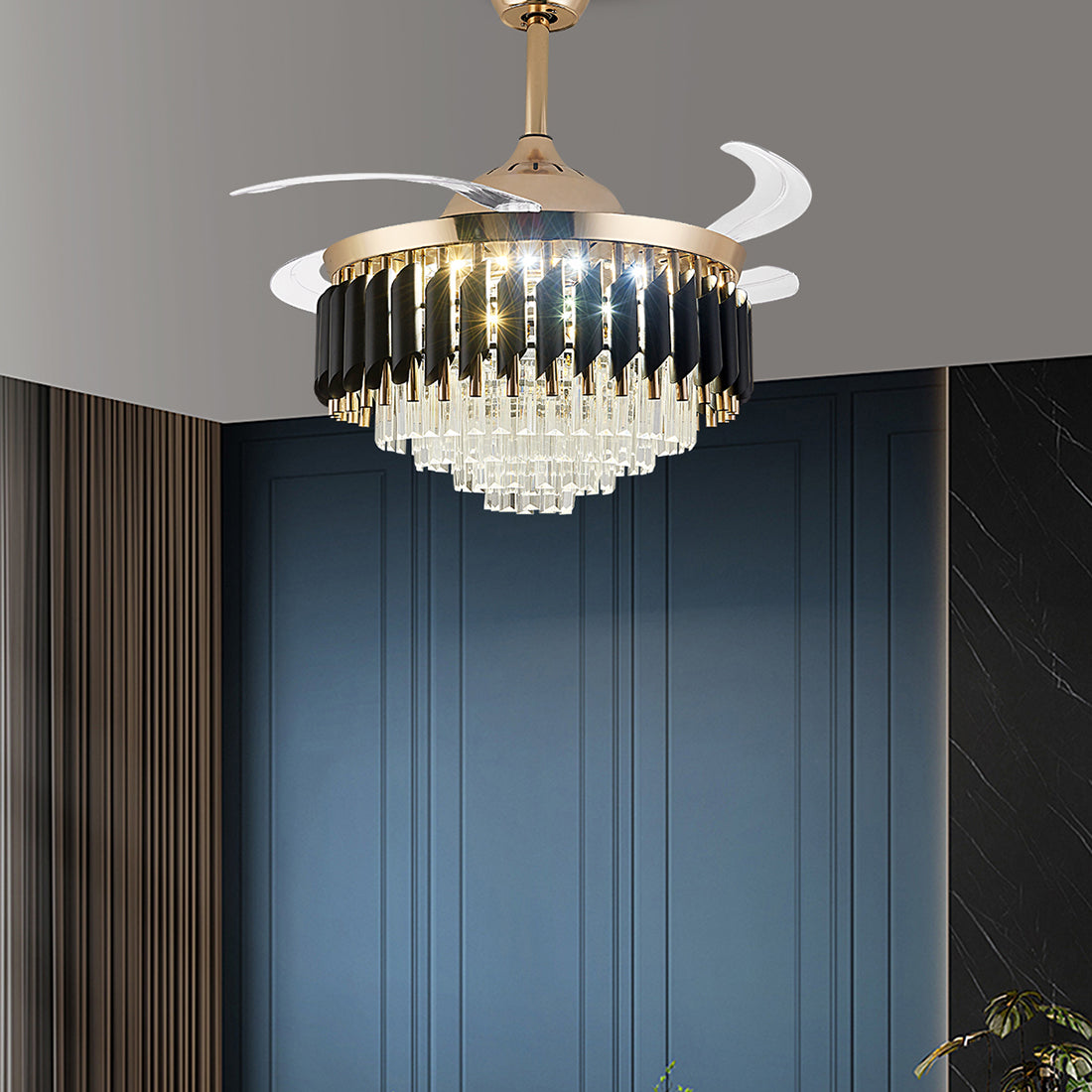 Ventilador de techo decorativo moderno con aspas retráctiles, control remoto y app. Acabado negro mate con detalles en dorado y lingotes de cristal cortado. Luz blanca, cálida y neutra, 6 velocidades y modos verano/invierno. Elegancia, funcionalidad y confort en cualquier espacio.