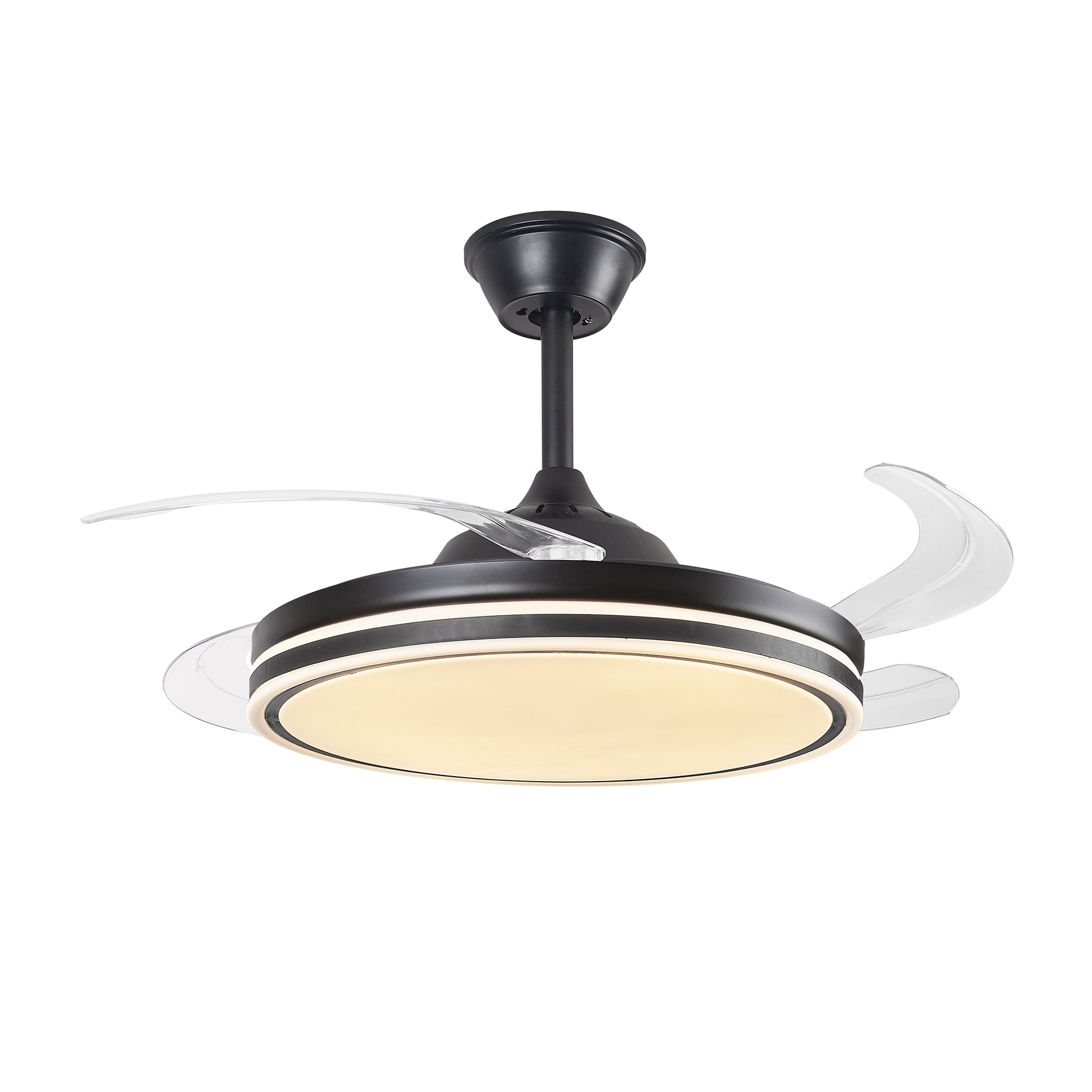 Ventilador decorativo moderno con aspas retráctiles y control remoto/app. Acabado en negro mate con difusores laterales, combina elegancia y funcionalidad. Incluye luz blanca/cálida/neutra, 6 velocidades y modo invierno/verano, ideal para cualquier espacio del hogar.